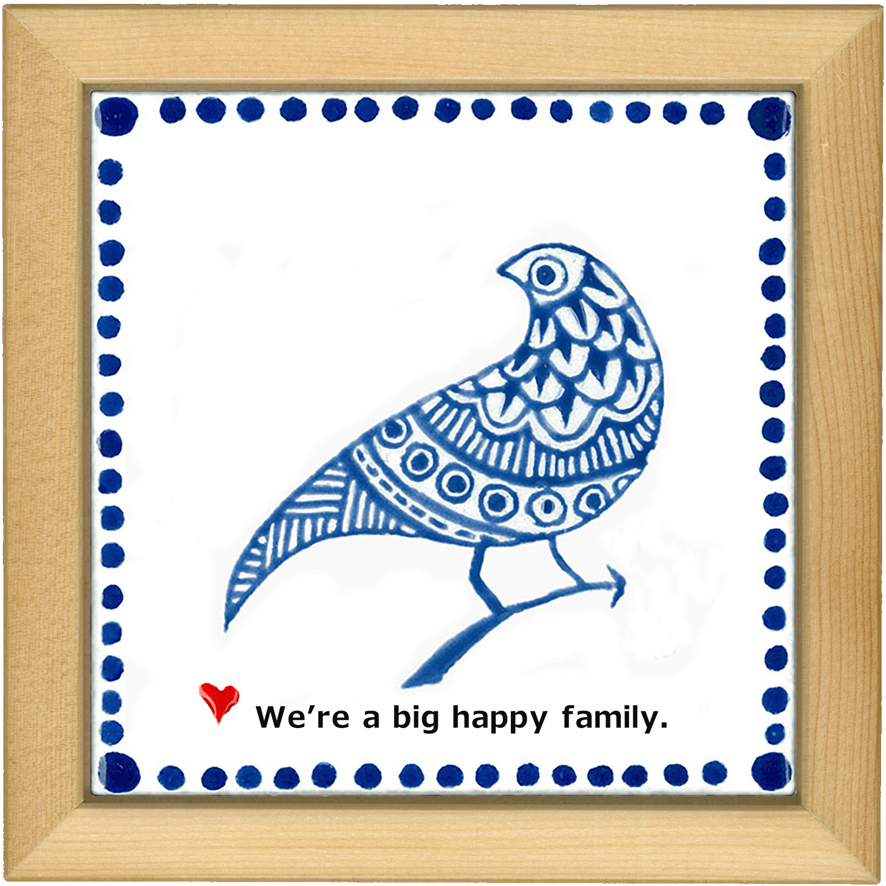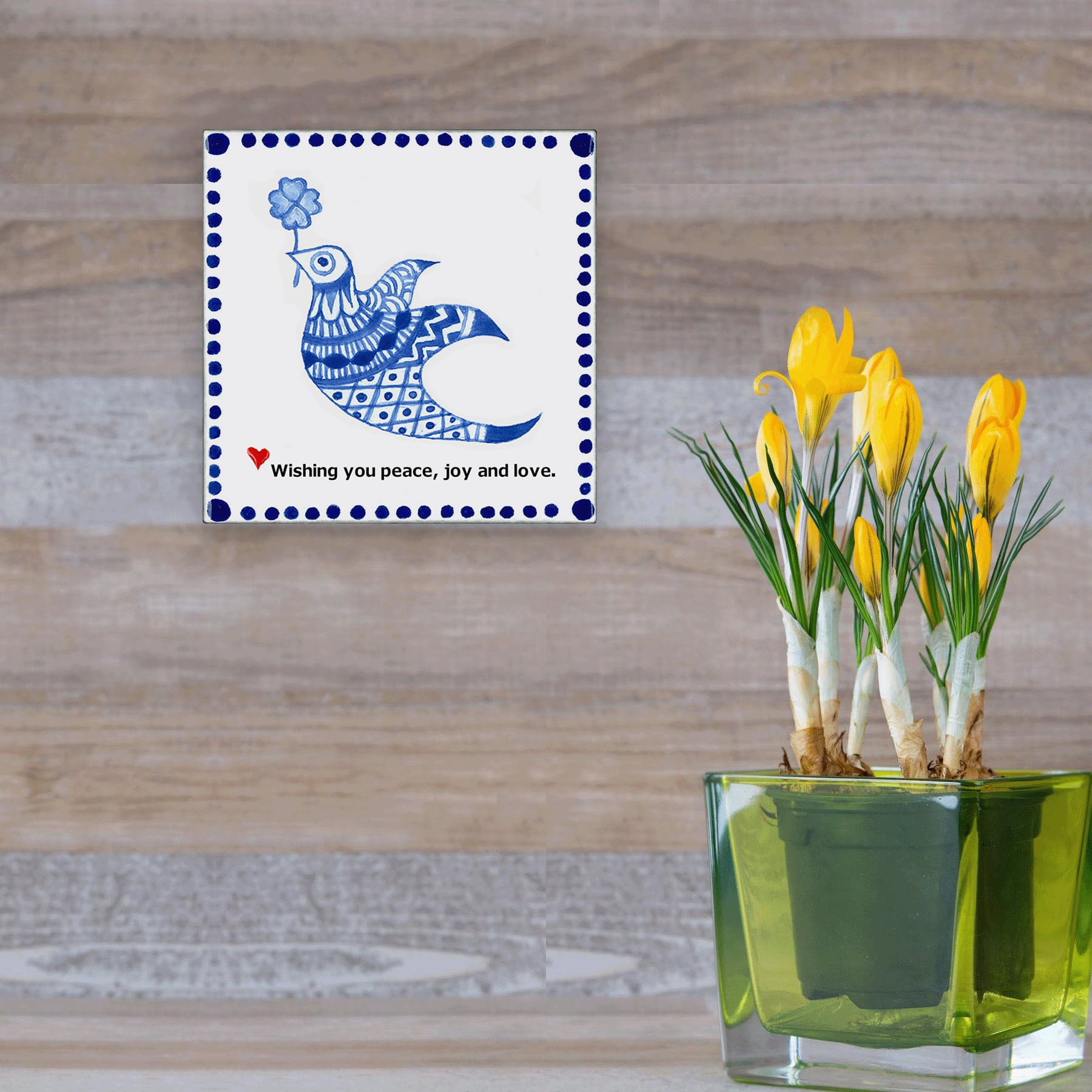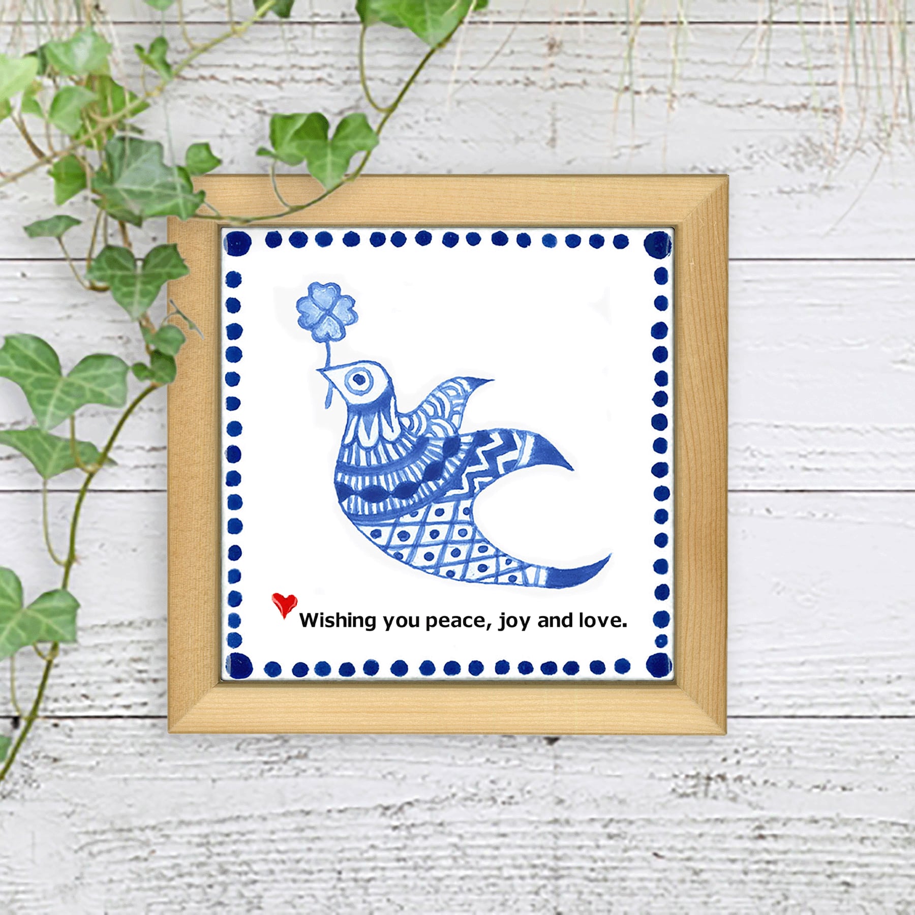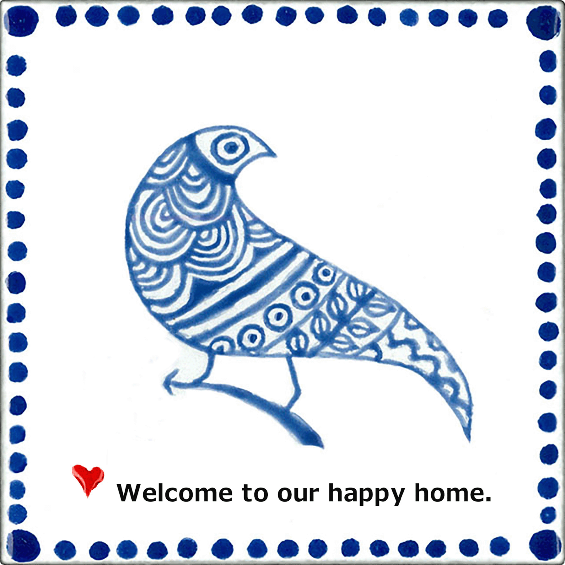 Our hand-painted tiles are unique art crafts that add color and charm to any space. They are suitable for both indoor and outdoor display and make perfect gifts. Messages can be purchased in the “Message” section. You can select from our suggested messages, or if you wish to add your own, you may include up to 36 characters (including spaces and punctuation). If you would like to add a frame, please purchase it in the “Frame” section. Inspired by Maurice Maeterlinck’s fairy tale “The Blue Bird,” this series conveys the message that “Happiness is often right beside us, yet we fail to notice it.”