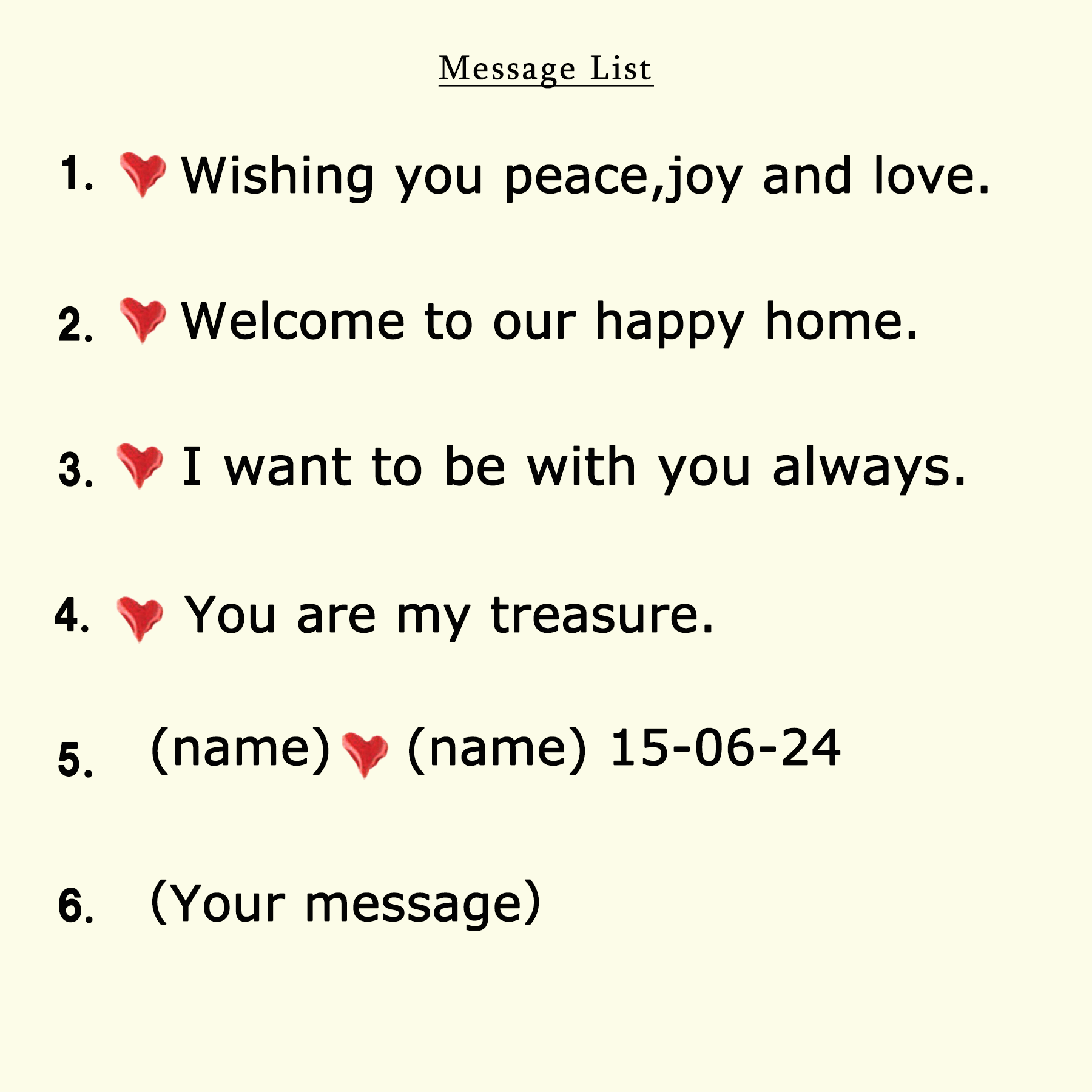 私達が提案する5種類のメッセージとあなたのご希望のメッセージ(文字数はスペースや句読点を含めて最大36文字まで)からお選び下さい。手書きのため、書体の指定はお受け出来ない事をご了承願います。
