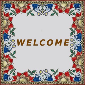 A small arched window-like frame surrounded by a bouquet of flowers. Available in two color variations: 1. Blue-toned version, 2. Colorful version