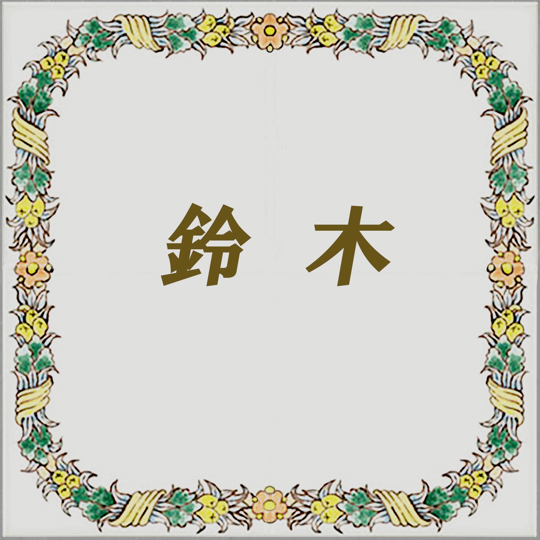 フレームをデザインしたタイルに名前、住所、または短いテキストも焼き付けてパーソナライズできます。表札や看板に最適です。私たちは、名前や住所、または短いテキストを焼き付けることでカスタマイズ可能なフレーム付きタイルを提供しています。サイズは、15cm×15cm(15cm×15cm 1枚)です。5タイプのデザインを用意しています。スペース①に追加できる文字の最大数は、スペースや句読点を含む12文字です。ただし手書きのため文章の書体指定はお受け出来ない事をご了承願います。