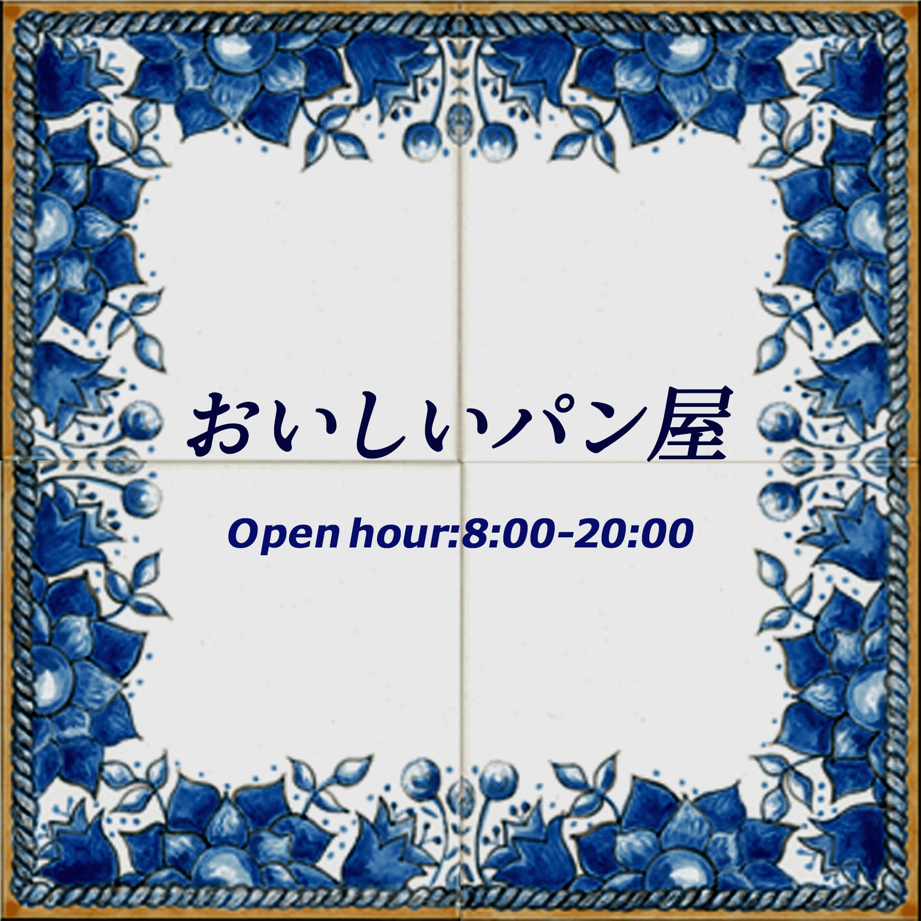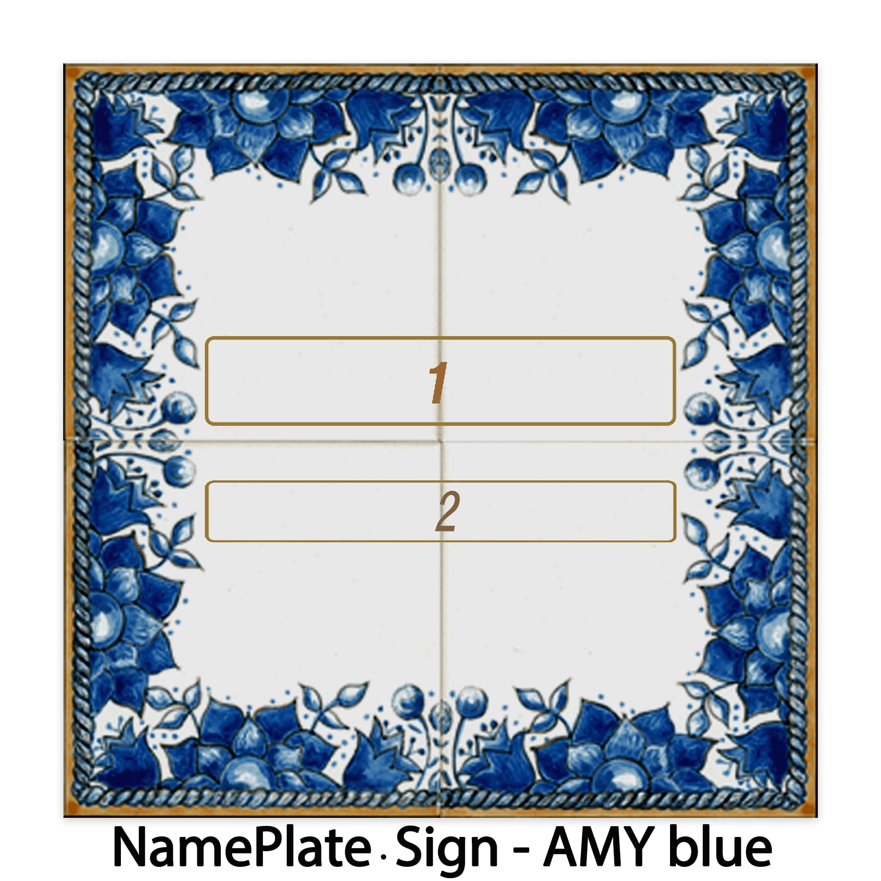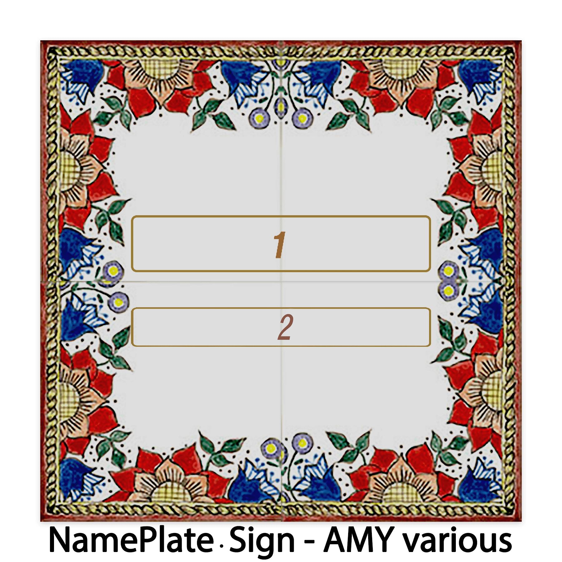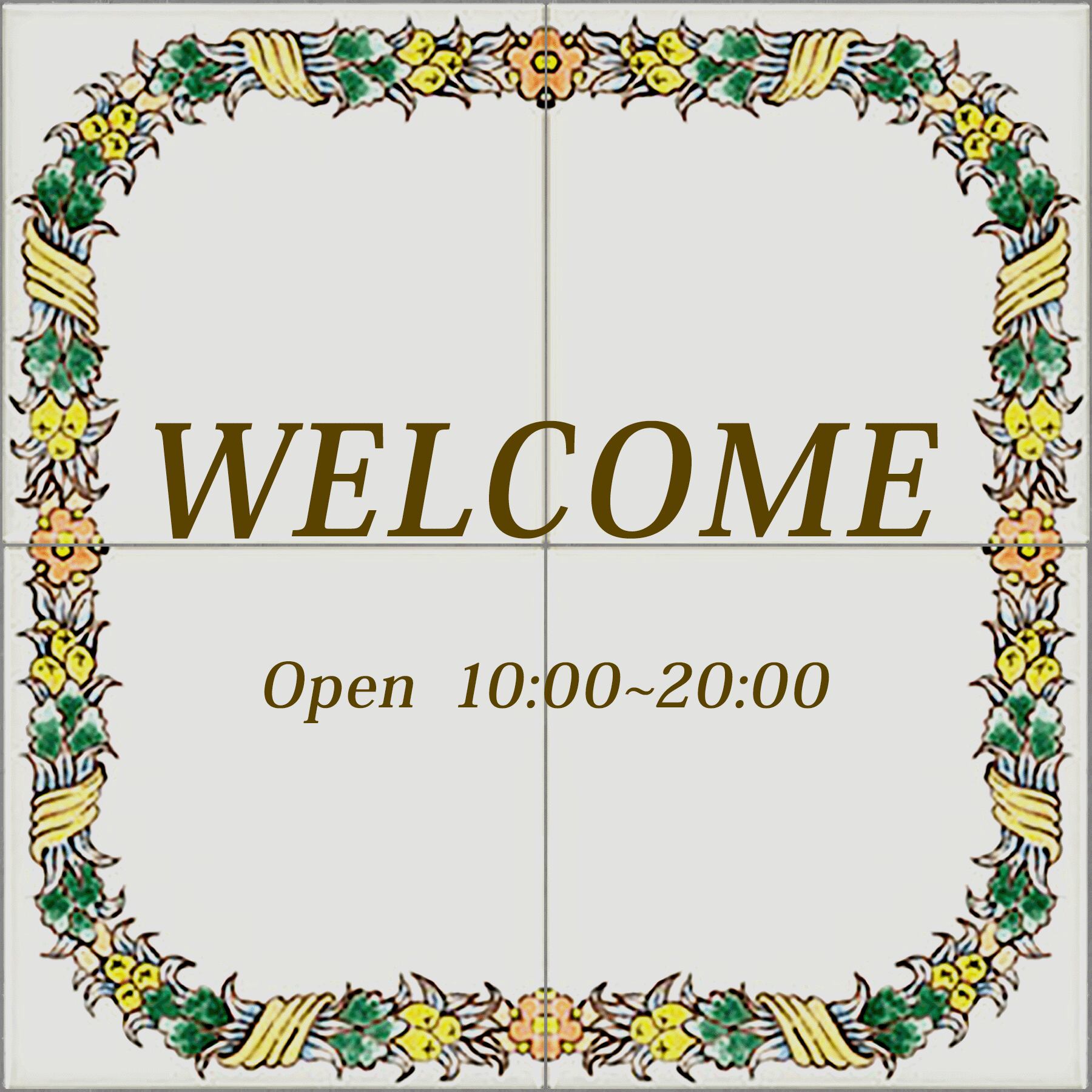 フレームをデザインしたタイルに名前、住所、または短いテキストも焼き付けてパーソナライズできます。表札や看板に最適です。私たちは、名前や住所、または短いテキストを焼き付けることでカスタマイズ可能なフレーム付きタイルを提供しています。サイズは、20cm×20cm(10cm×10cm4枚)です。5タイプのデザインを用意しています。