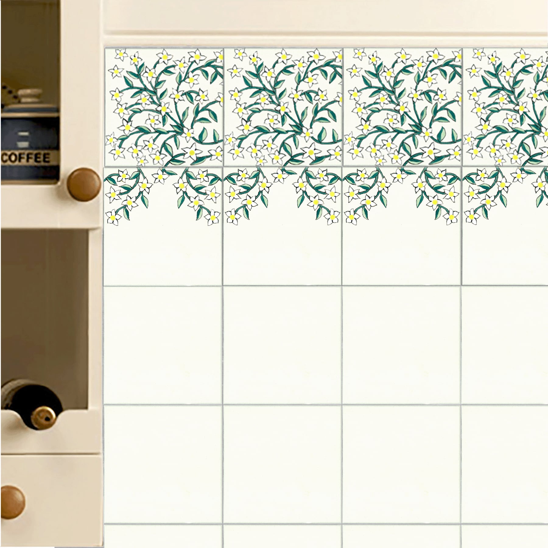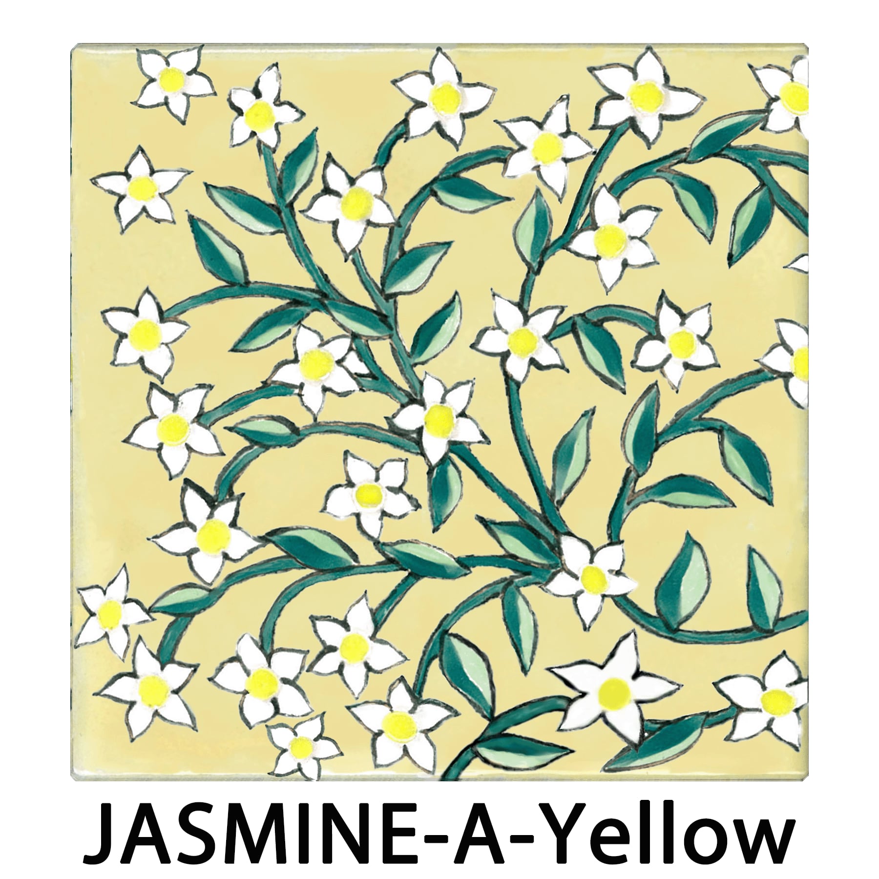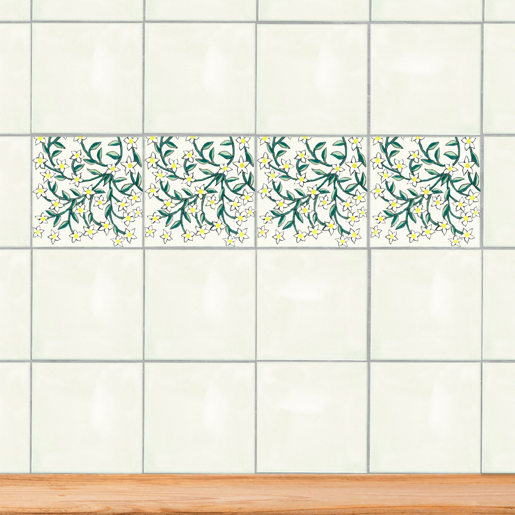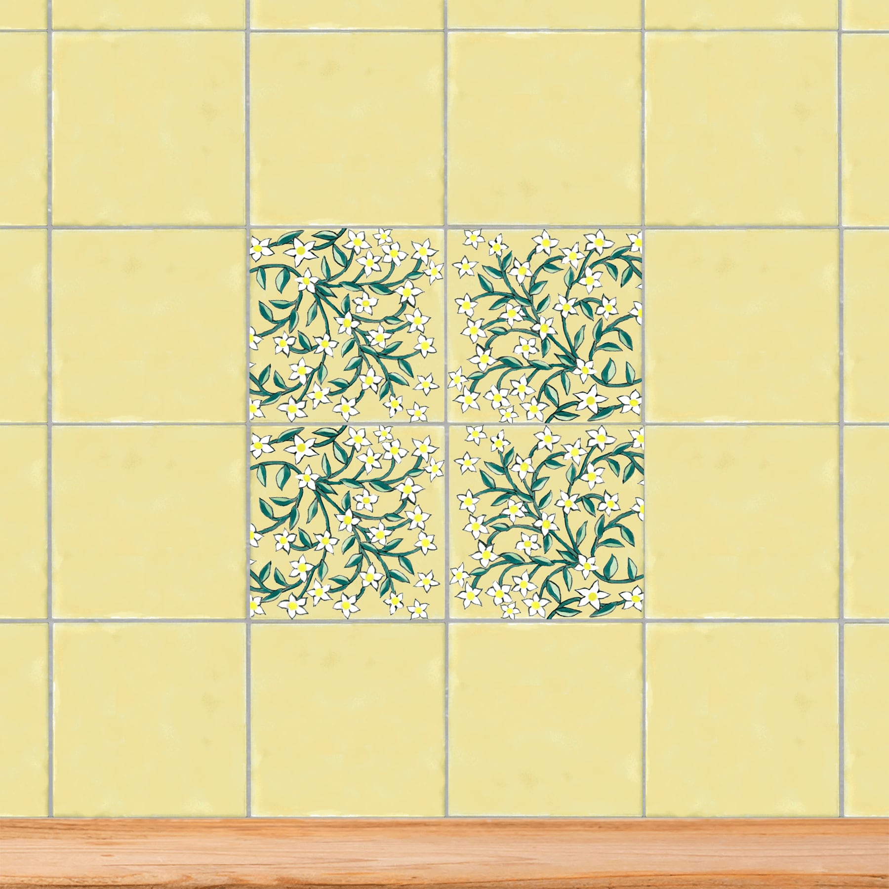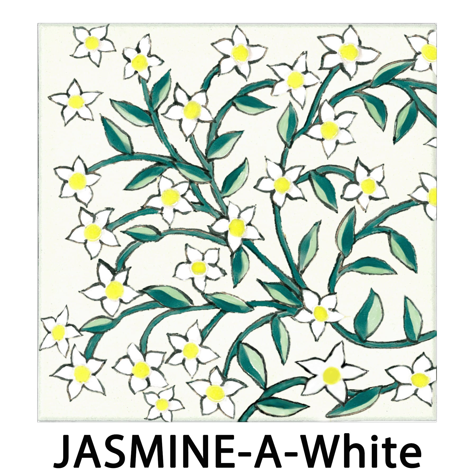 The flowing jasmine pattern along the border creates a fresh and graceful atmosphere.The design comes in two variations, and each set includes four tiles.