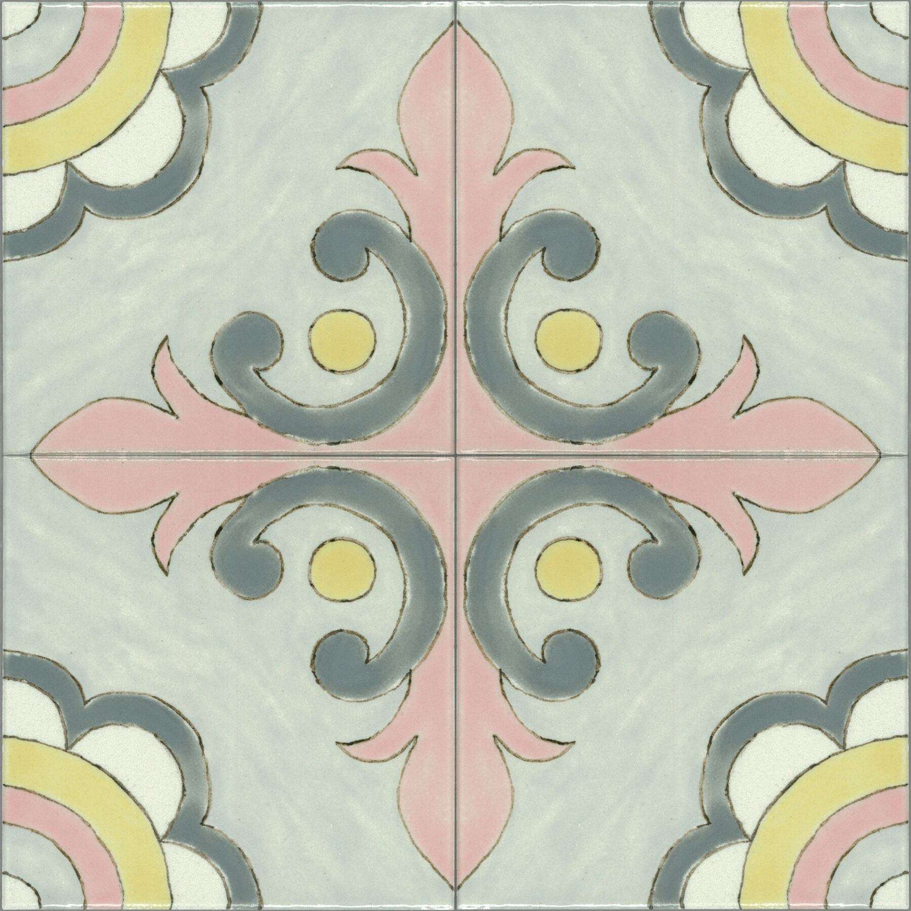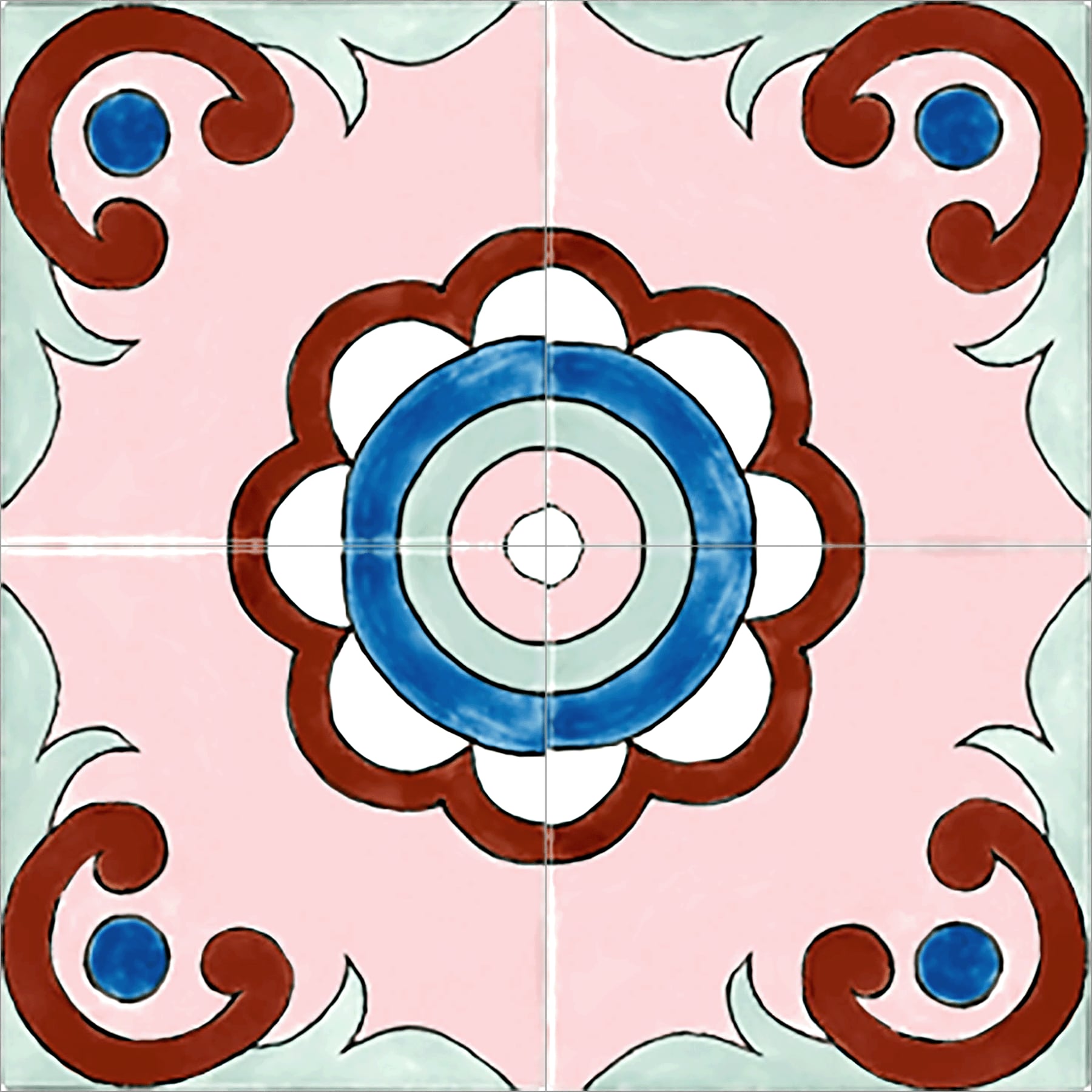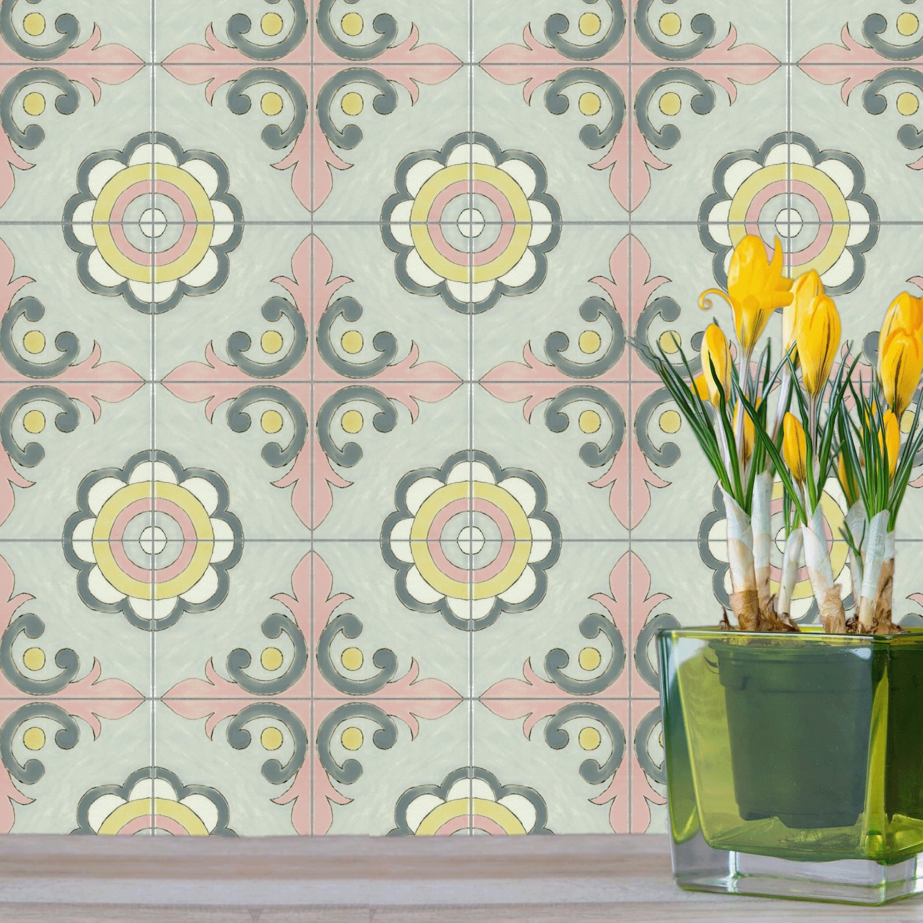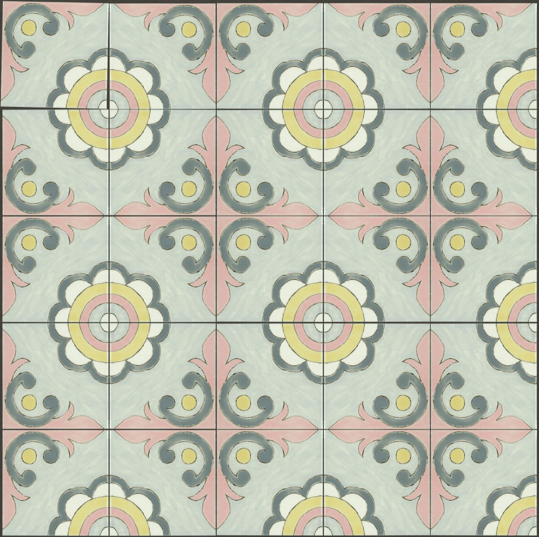 Angela is a beautiful design that combines four tiles that reproduce retro floral patterns.