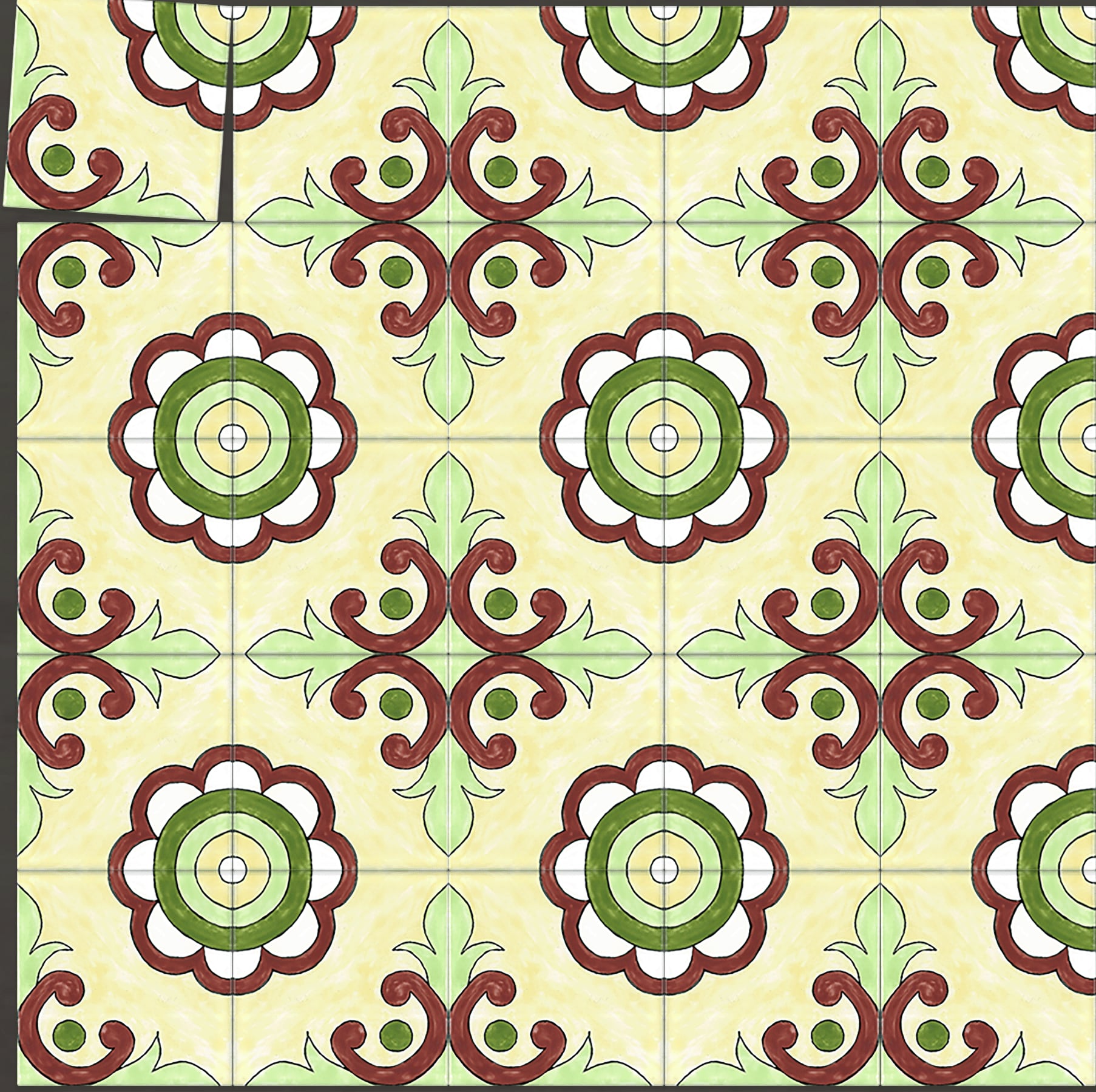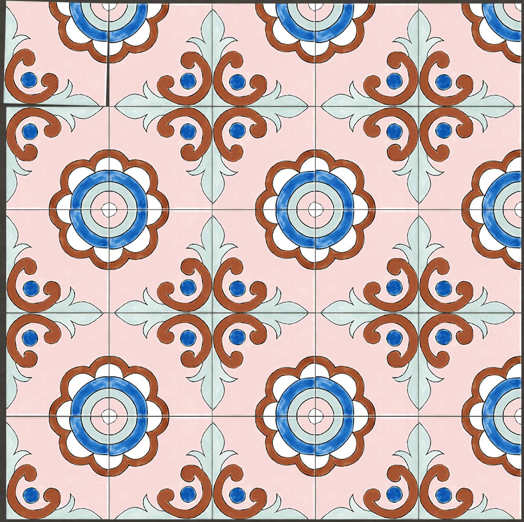 アンジェラは、レトロな花柄を再現した4枚のタイルを組み合わせて、1つの美しいデザインに仕上げています。