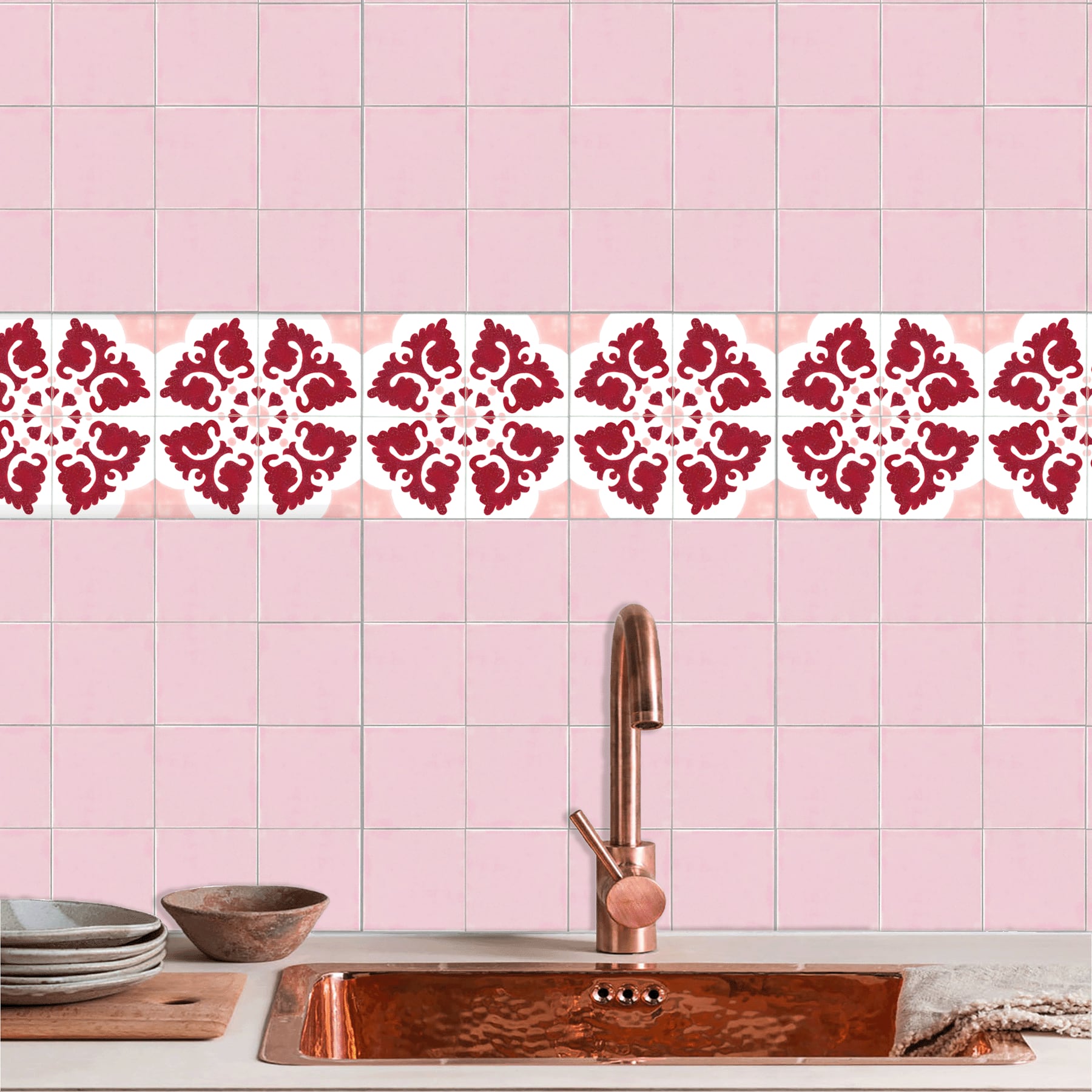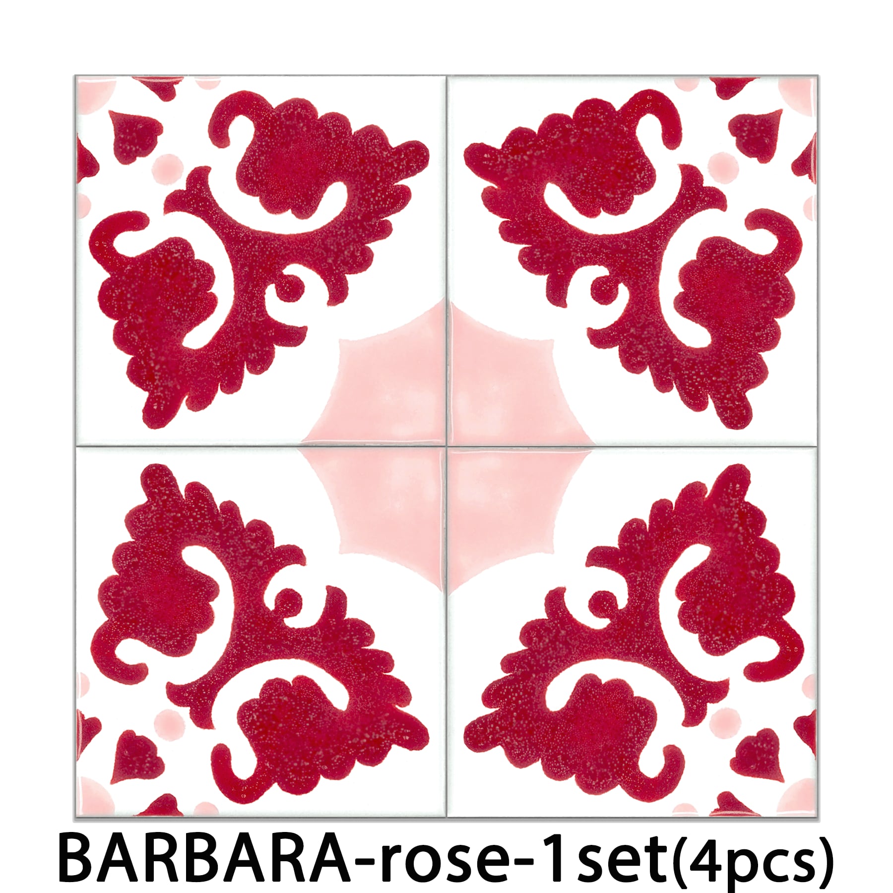Barbara combines four tiles to create one beautiful geometric pattern. The simple yet exotic design adds spice to any interior. Ideal for accents in dining rooms and living rooms as well as entryways and bathrooms, one set consists of four tiles and is available in three different color variations.