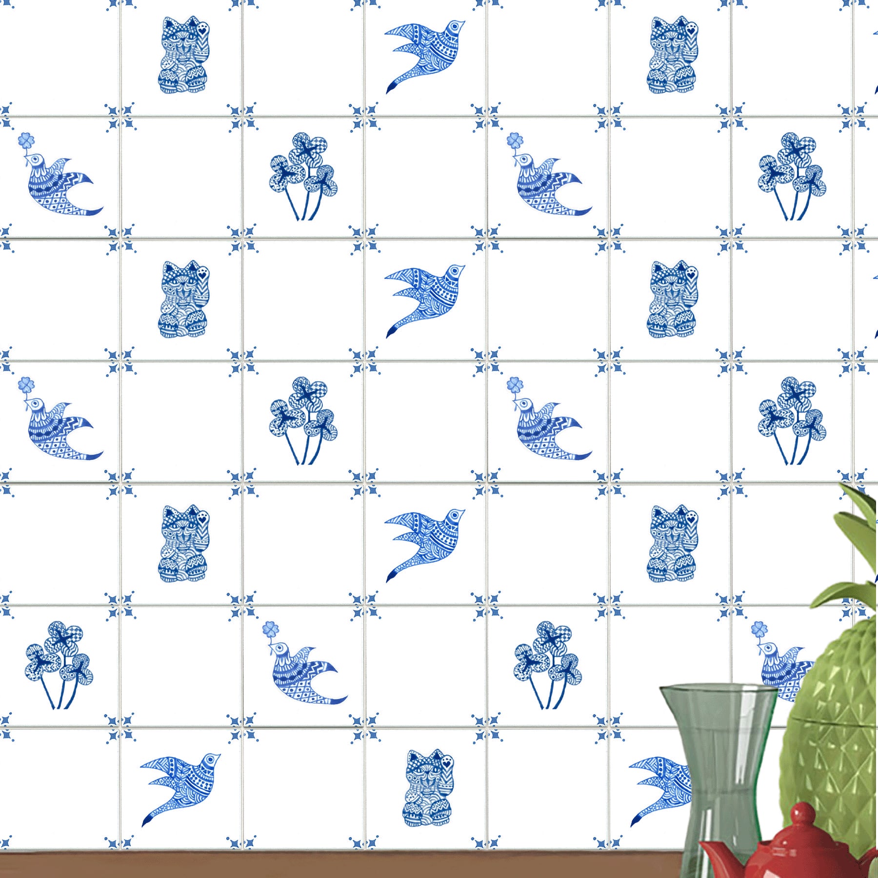 デルフトタイルのようにタイルの端にフレームやコーナーにオーナメントを施しました。