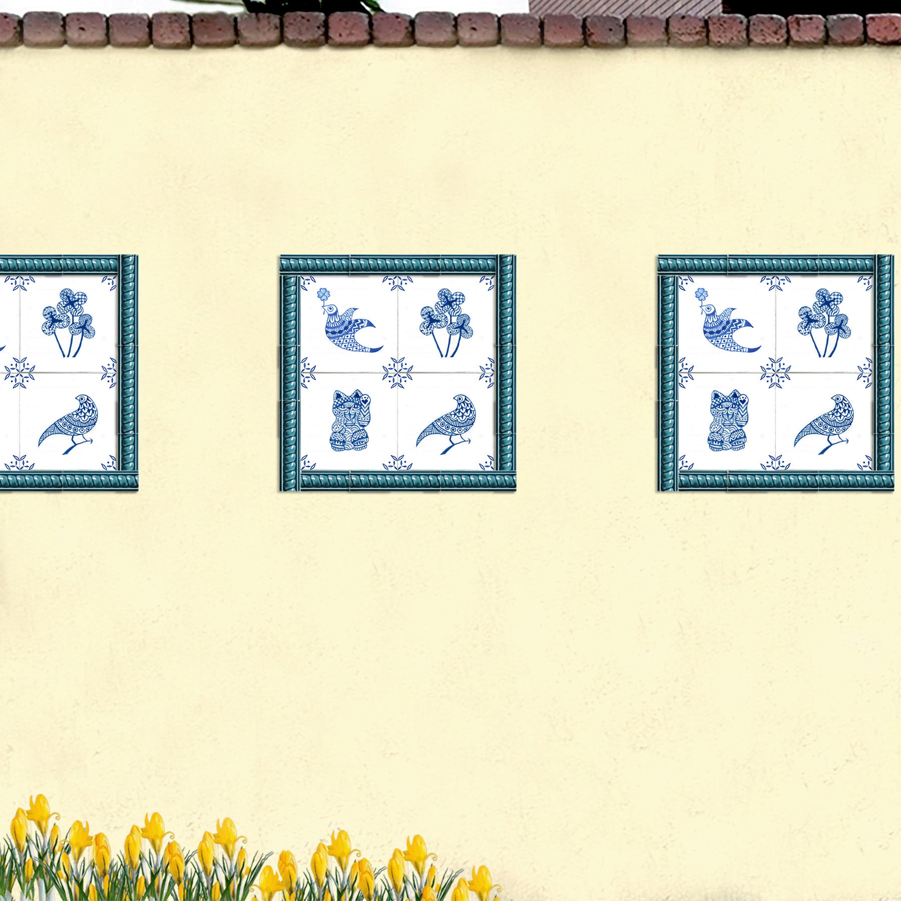 Ornate frames and corners are applied to the edges of the tiles like delft tiles.