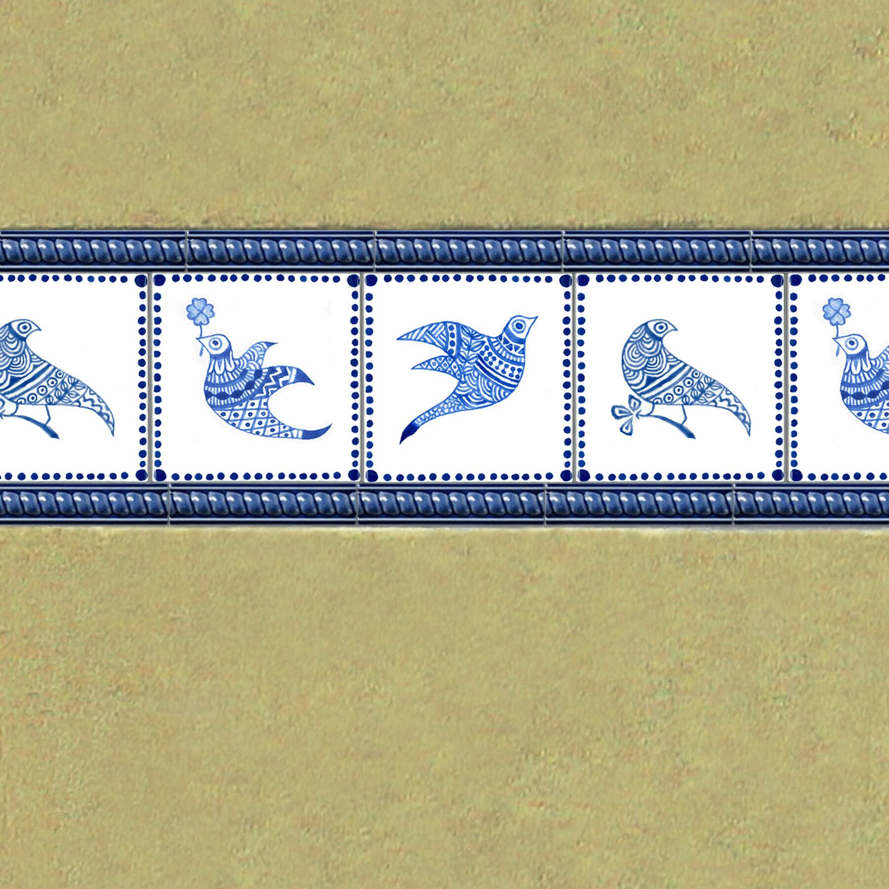 枝にとまる青い鳥の愛らしい姿が、インテリアにさわやかな印象を与えます。ダイニングやリビングはもちろん、玄関や子供部屋のアクセントとしてもぴったりです。1枚ずつのタイルは、シンプルながらも存在感があります。