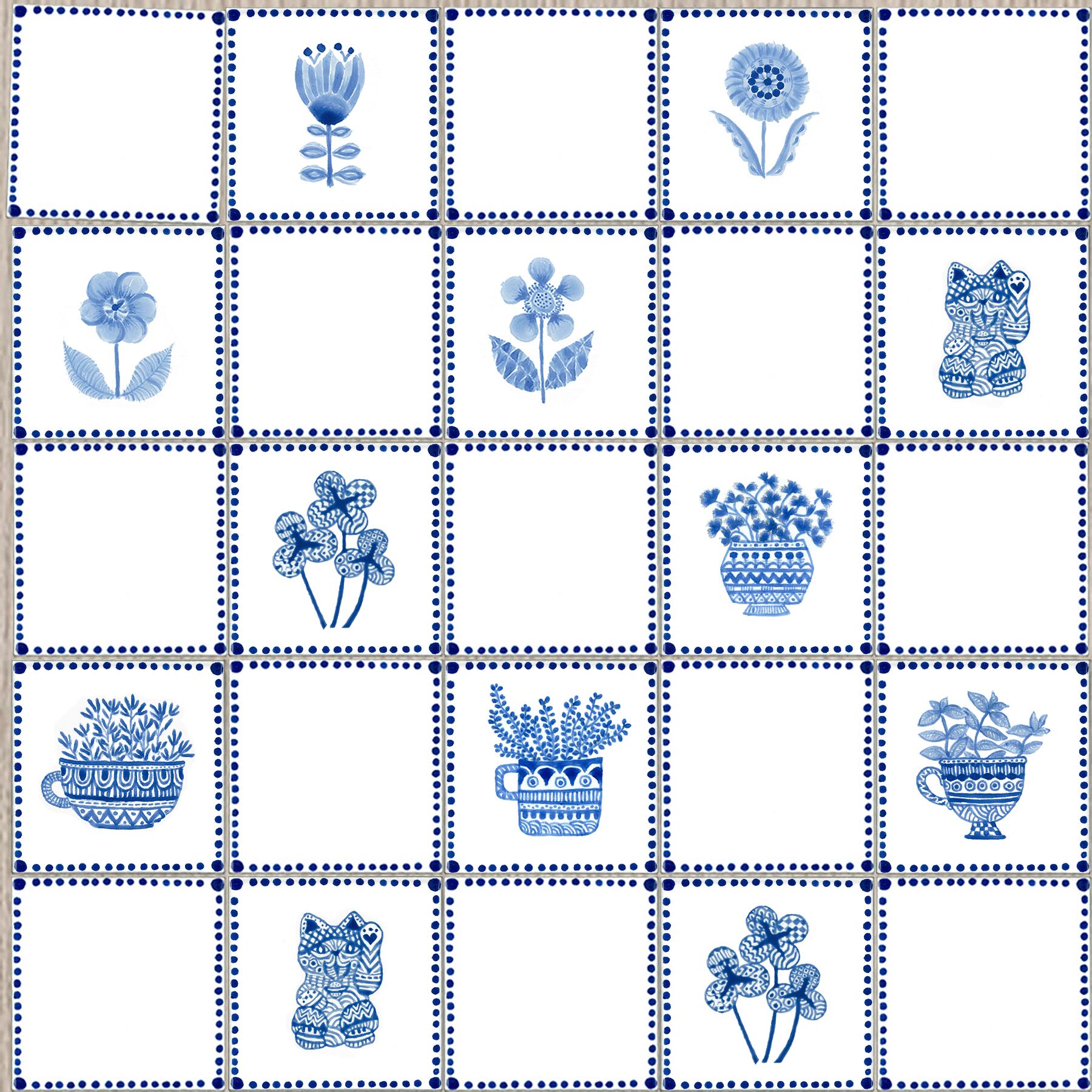 デルフトタイルのようにタイルの端にフレームやコーナーにオーナメントを施しました。