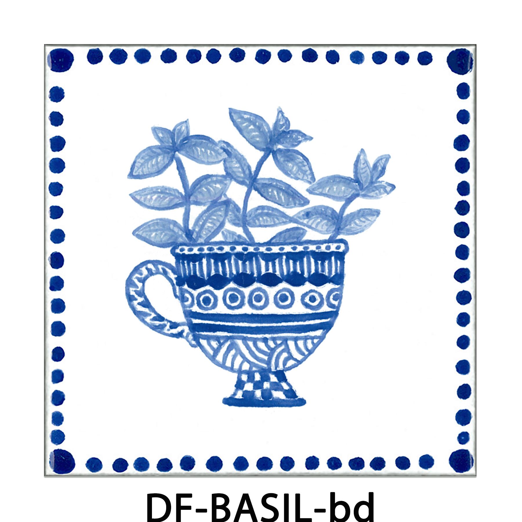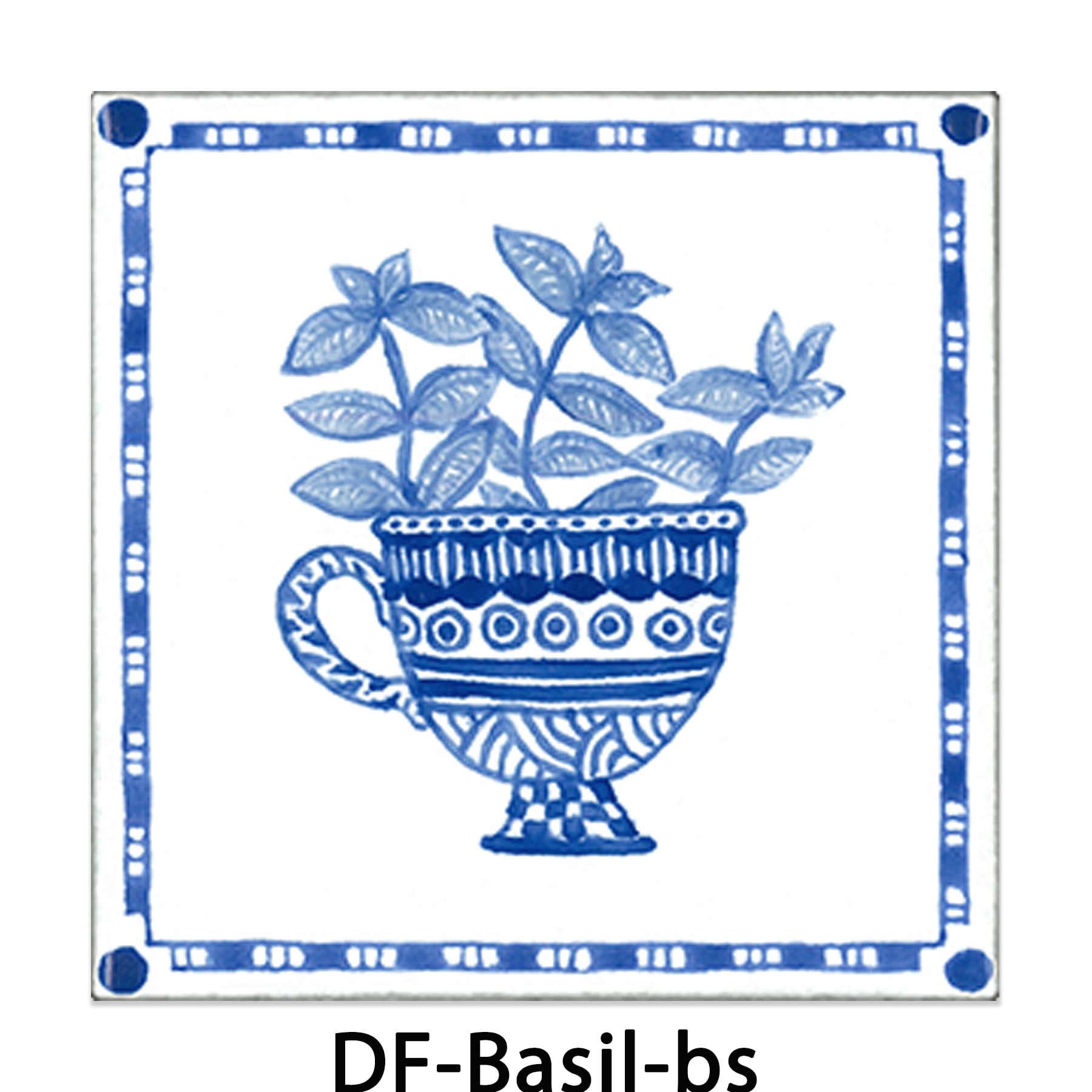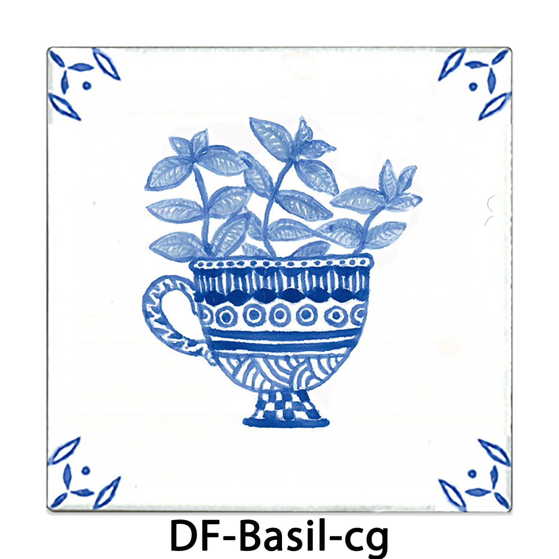 BASIL -バジル【100×100mm】植木鉢に植えたバジルをデザインしたデルフト調のタイルです。