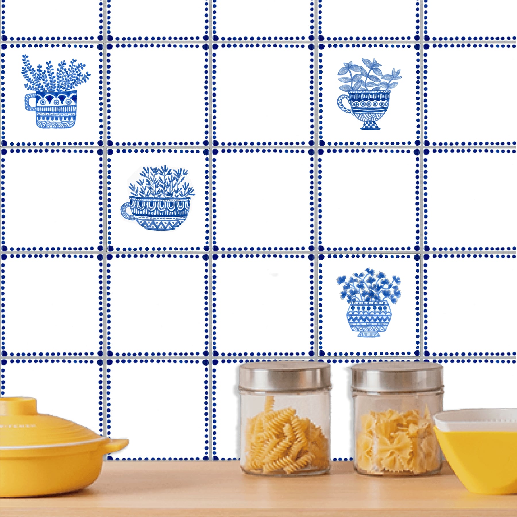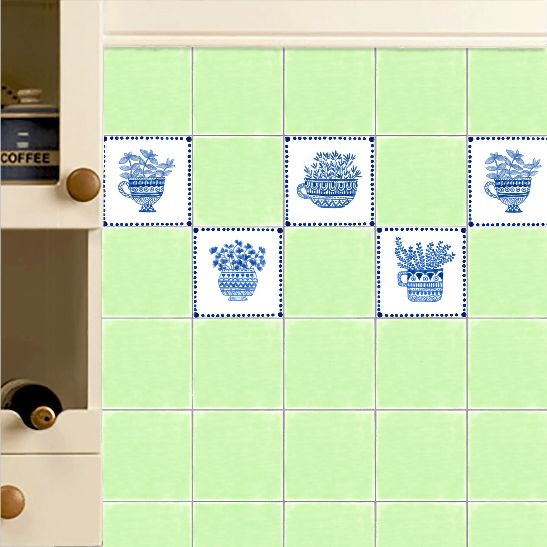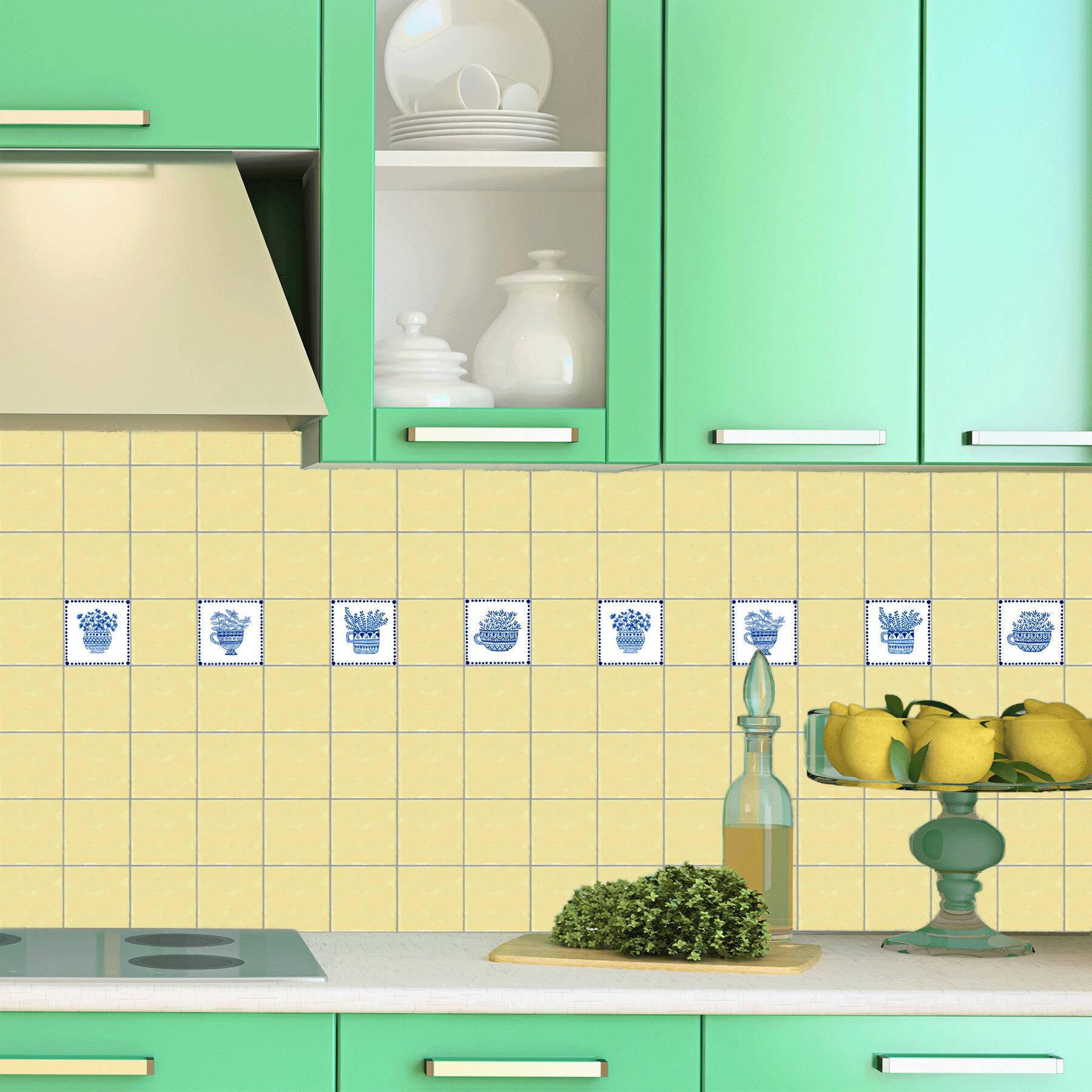 BASIL -バジル は、植木鉢に植えられたバジルをデザインしたタイルです。バジルの青い釉薬がインテリアに活気をもたらします。キッチンのバックスプラッシュにタイルを貼れば、家に暖かみを加えます。またレストランのアクセントとしても最適です。
