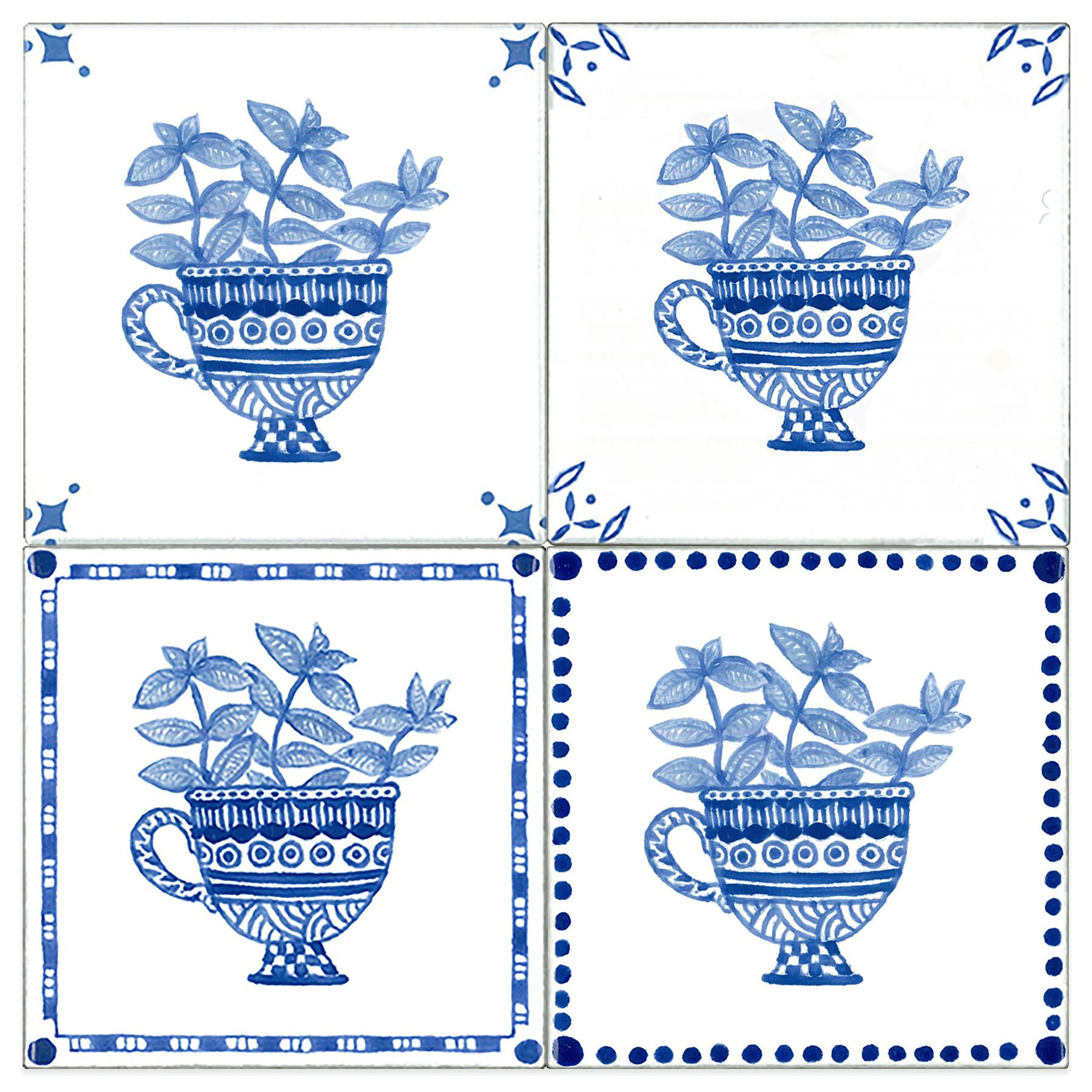 デルフトタイルのようにタイルの端にフレームやコーナーのデザインを施しました。昔からいろいろな用途で利用されているハーブは、「おだやかに体や心に働きかけ生活を豊かにしてくれる植物」の総称です。タイルの縁のボーダー柄やコーナーのデザインは、4種類あります。