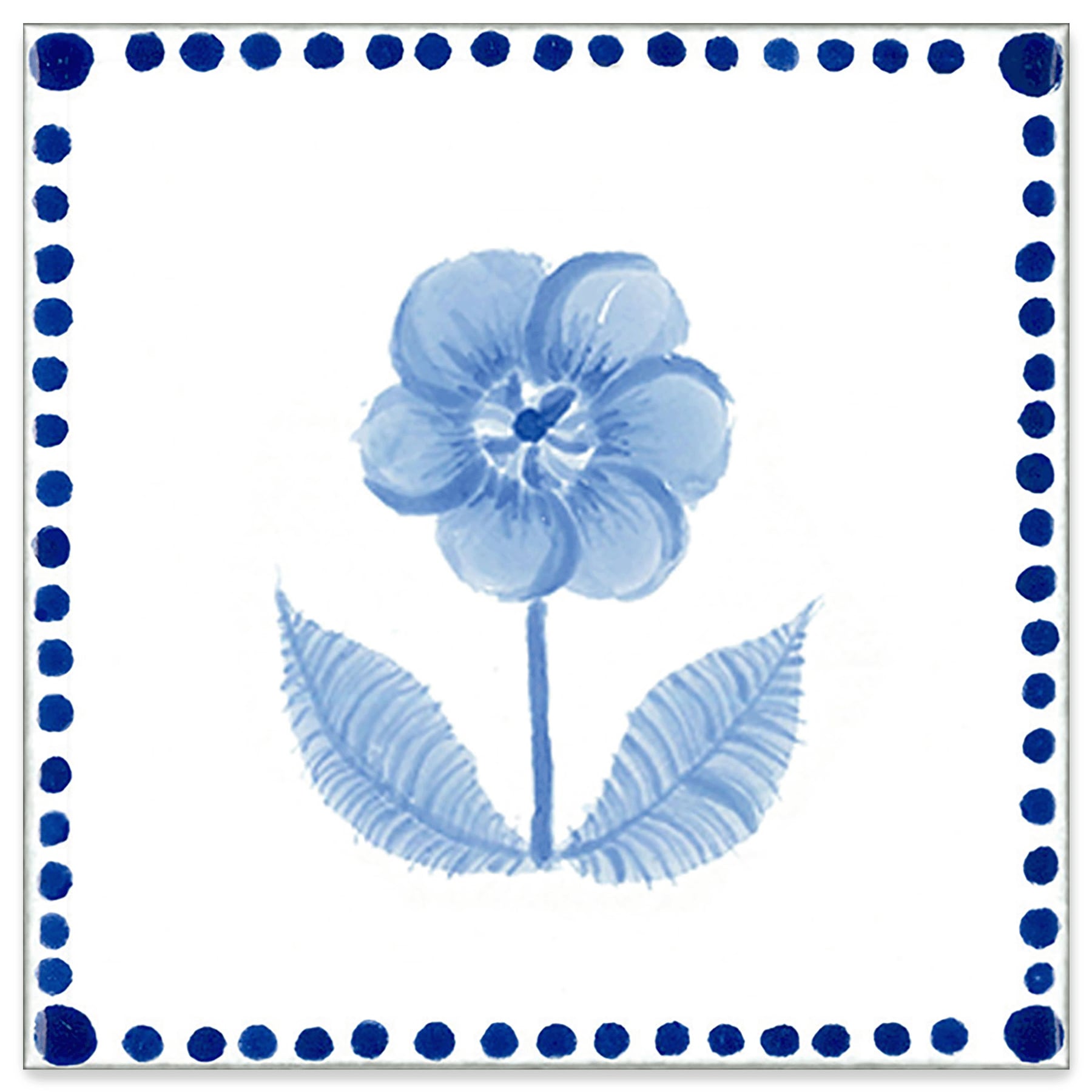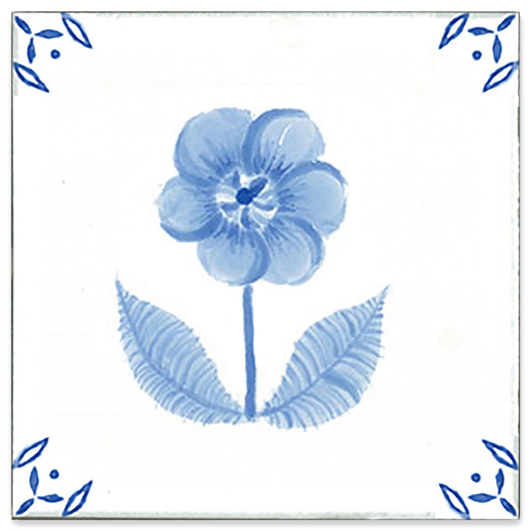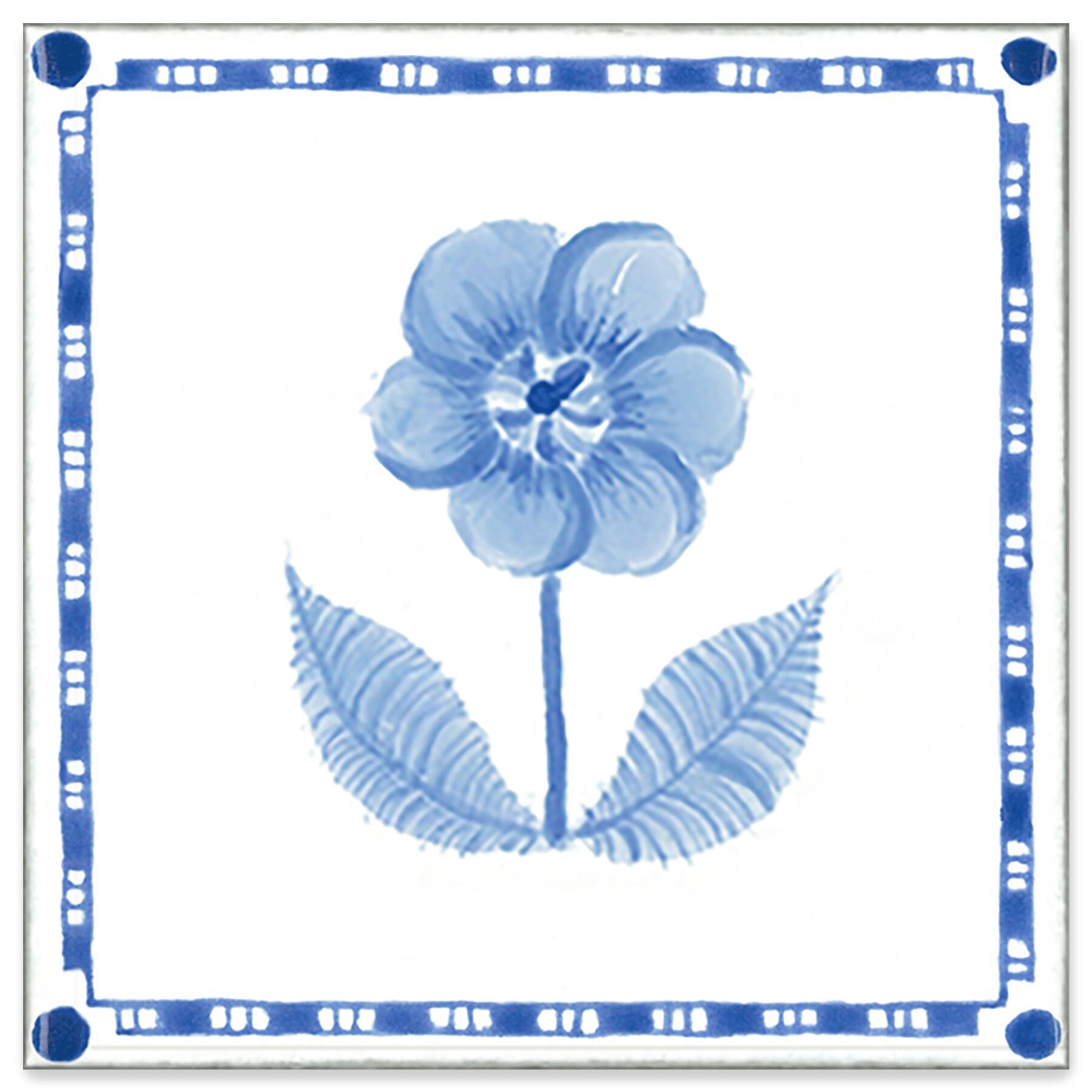 The flower with depth is depicted using subtle shades of blue in the ink painting style. The edge of the tile has a frame or corner design like delft tiles. There are four types of tile edge border and corner designs.