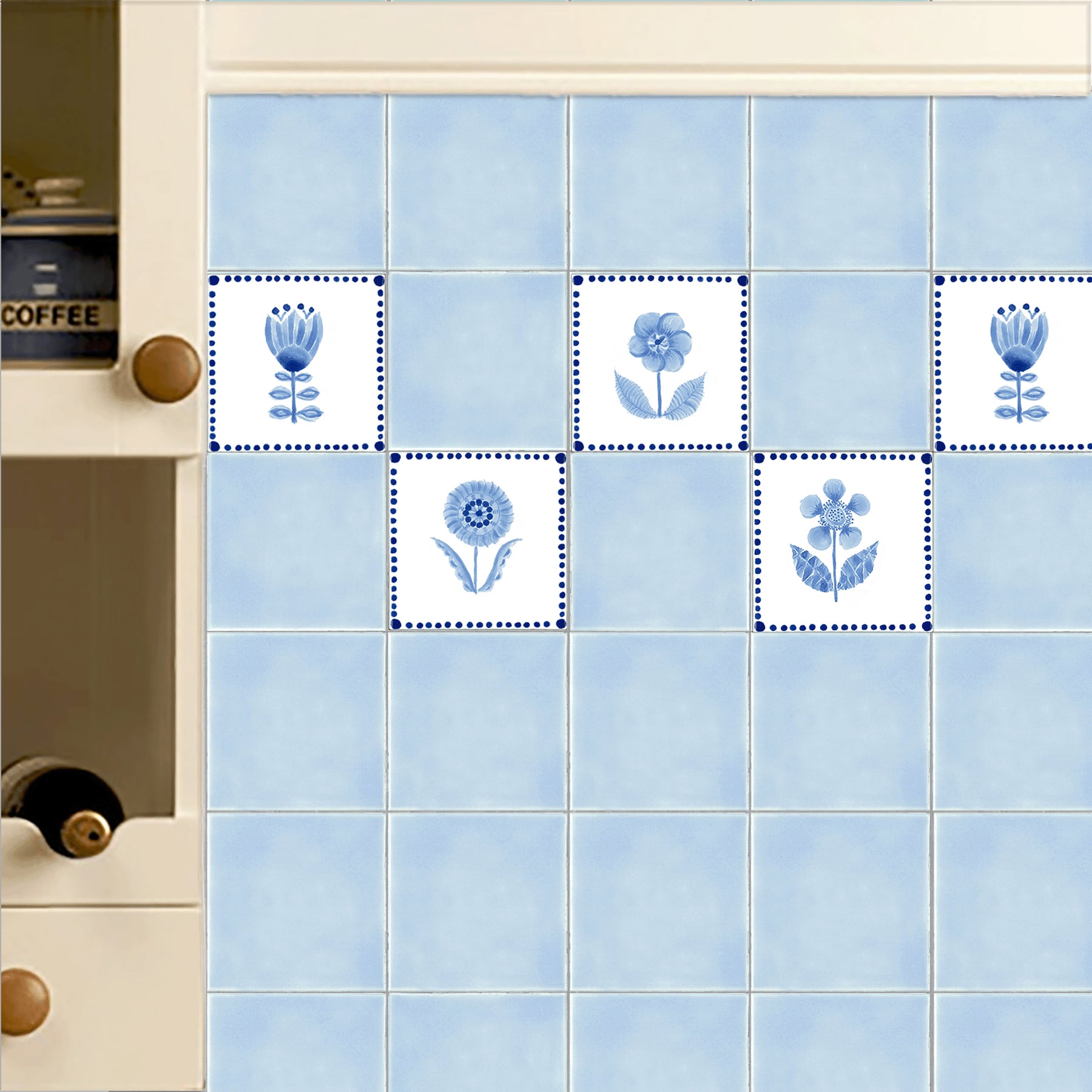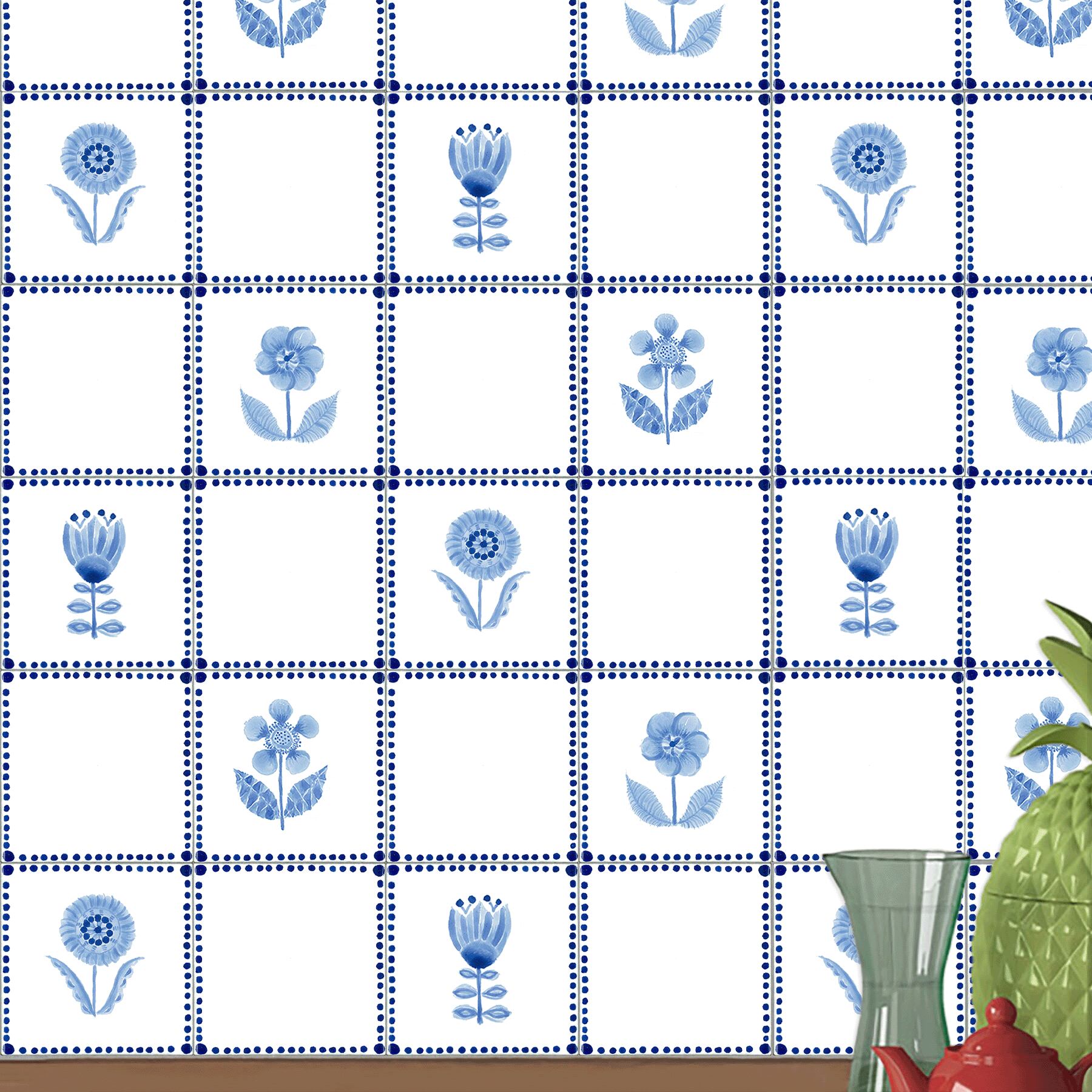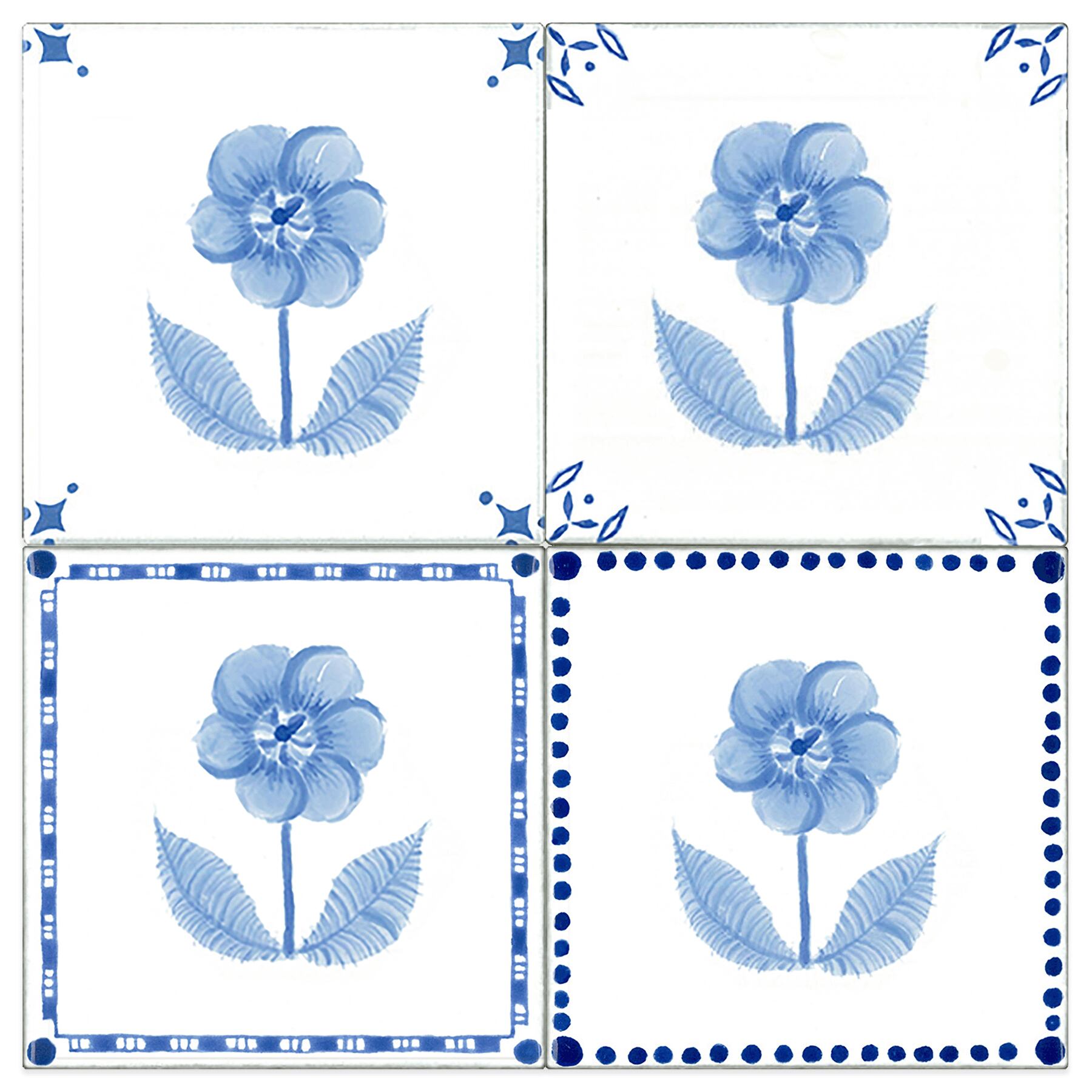 墨絵調の青の微妙な濃淡を駆使して奥行きのある花を描いています。デルフトタイルのようにタイルの端にフレームやコーナーのデザインを施しました。ボーダー柄で縁取られた4種類のモチーフを揃えました。
