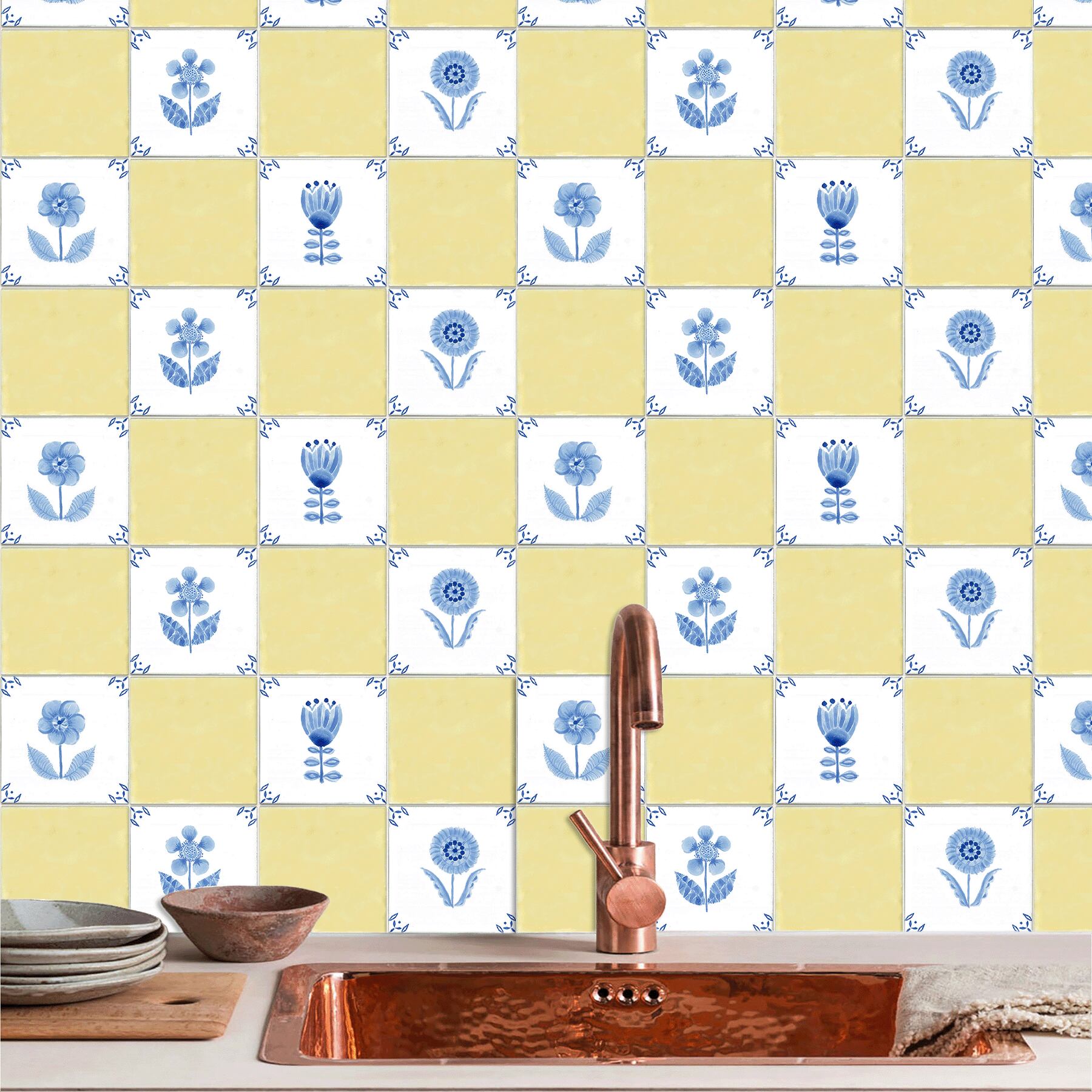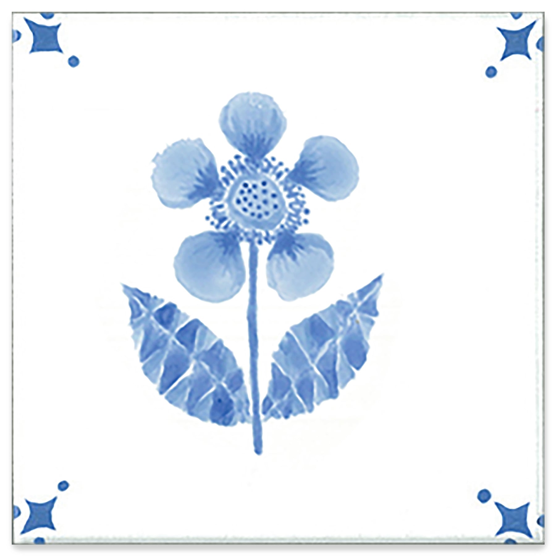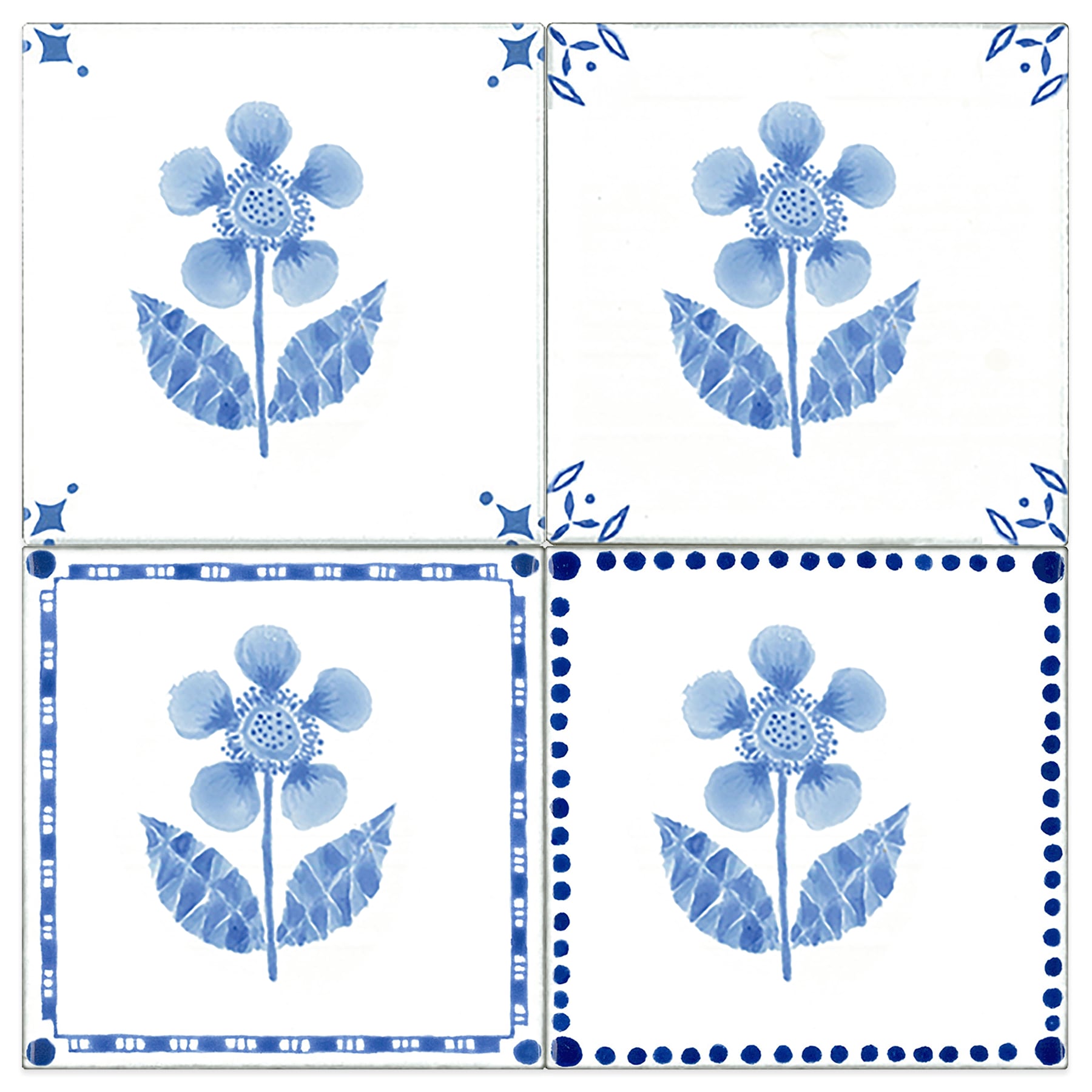 墨絵調の青の微妙な濃淡を駆使して奥行きのある花を描いています。デルフトタイルのようにタイルの端にフレームやコーナーのデザインを施しました。ボーダー柄で縁取られた4種類のモチーフを揃えました。