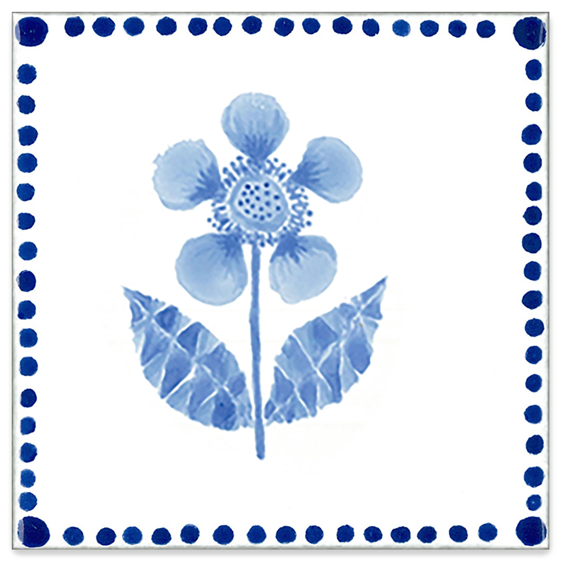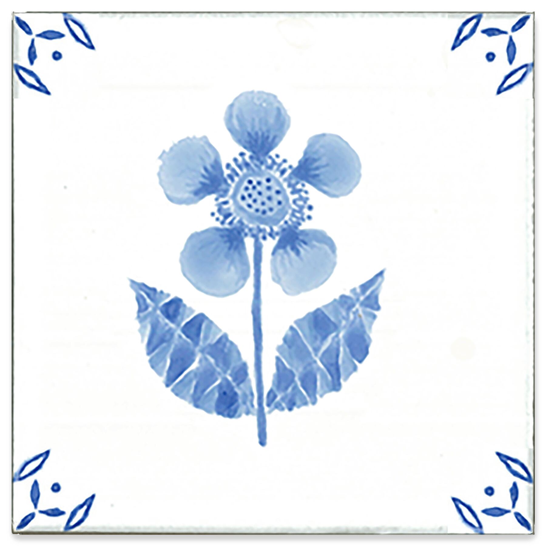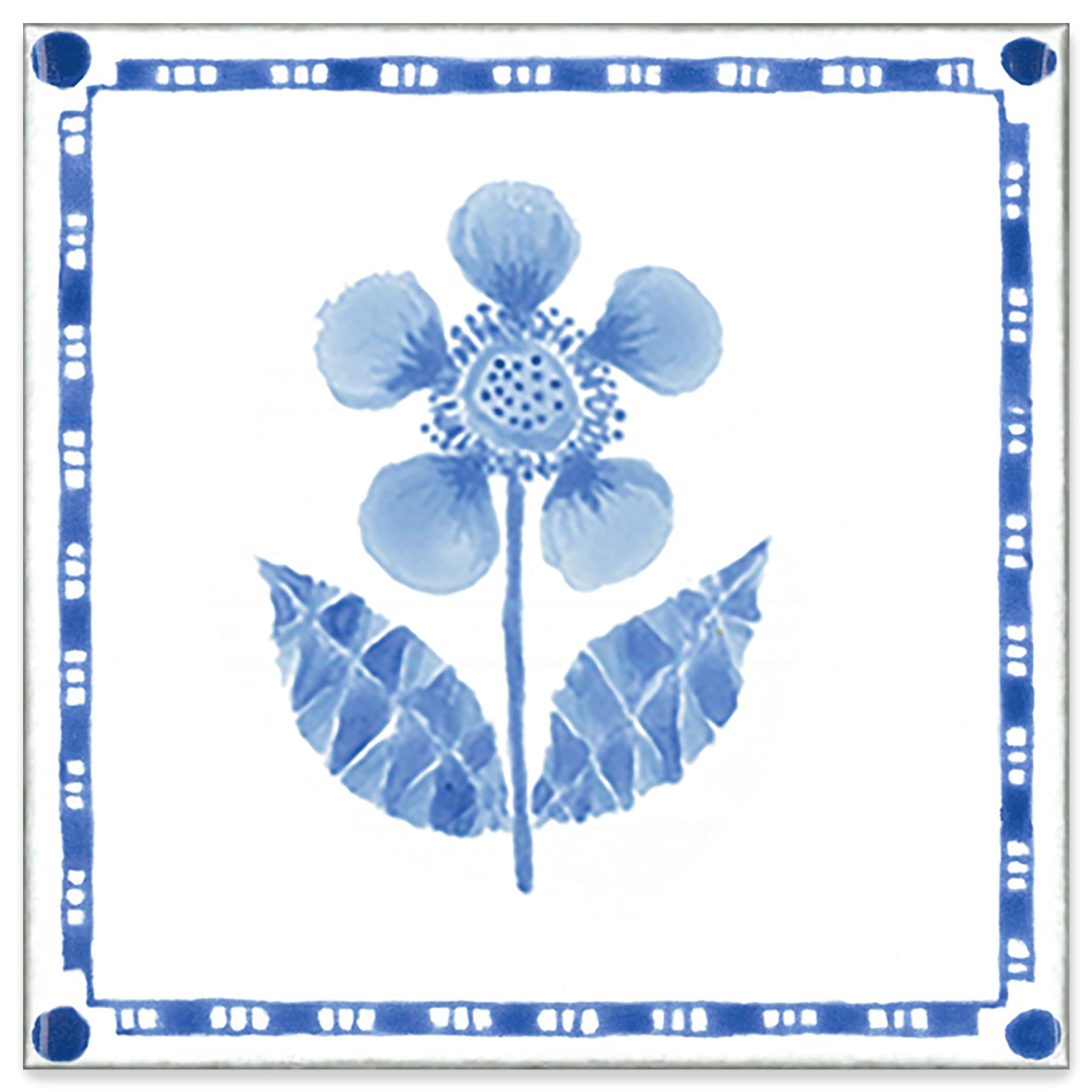 The flower with depth is depicted using subtle shades of blue in the ink painting style. The edge of the tile has a frame or corner design like delft tiles. There are four types of tile edge border and corner designs.