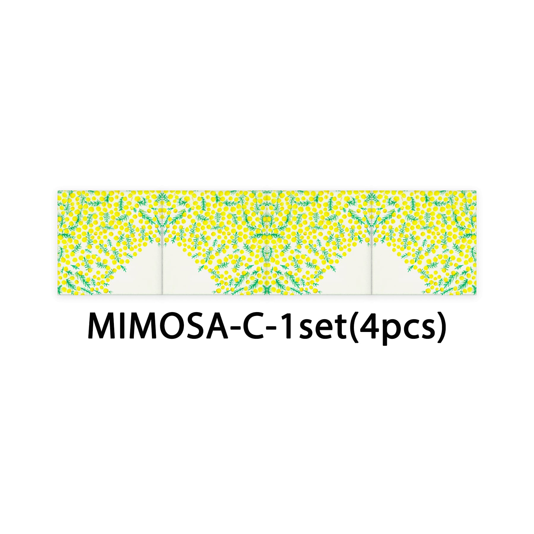 Mimosa is the yellow flower of happiness because of its sweet fragrance and dainty little flowers. The border mimosa pattern creates a fresh and elegant atmosphere. There are three designs, each consisting of four pieces in one set.