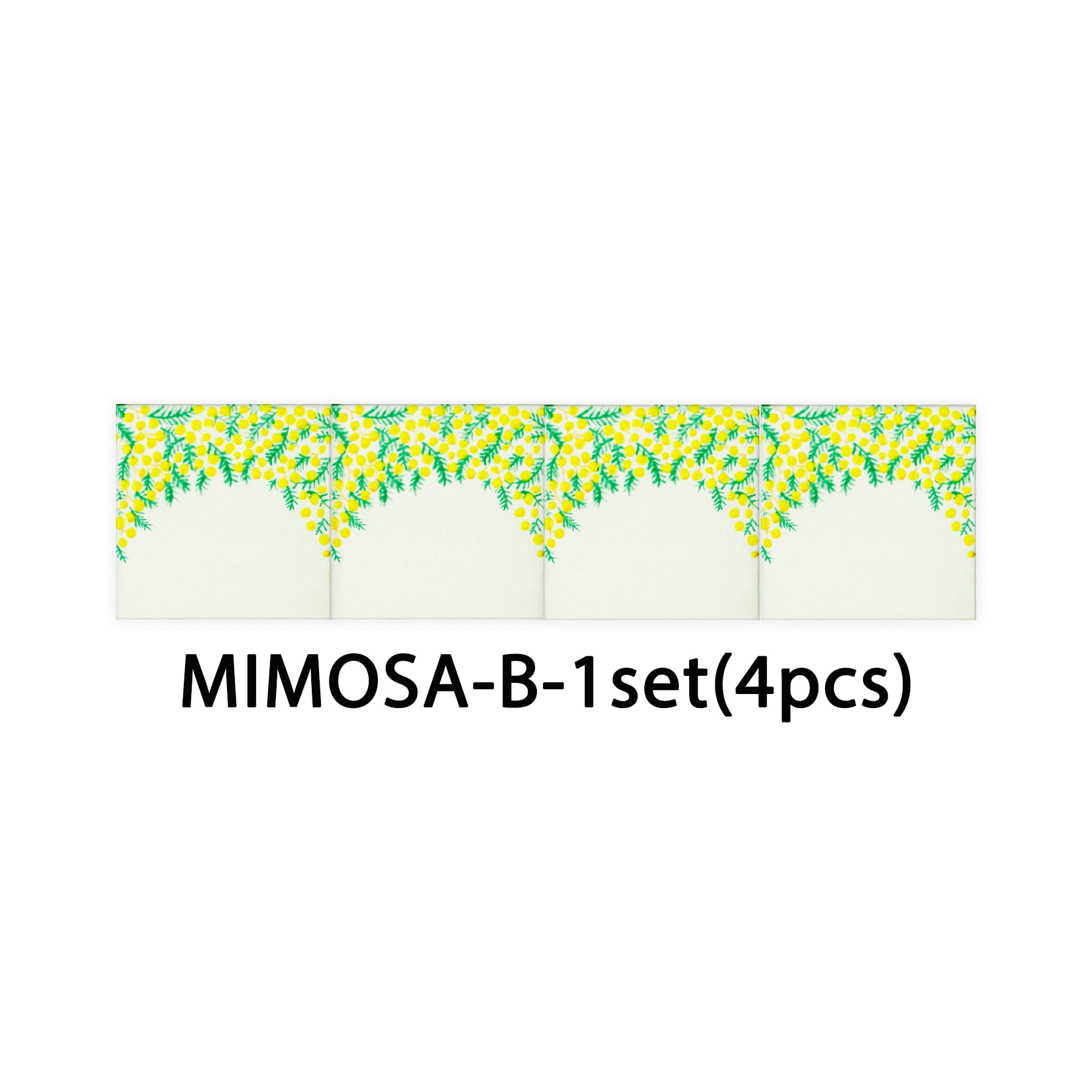 ミモザは、その甘い香りとかわいい小花から幸福の黄色い花と知られています。ボーダーに配したミモザ柄が、爽やかでエレガントな雰囲気を演出します。デザインは3タイプあり、それぞれ4枚が1セットになっています。
